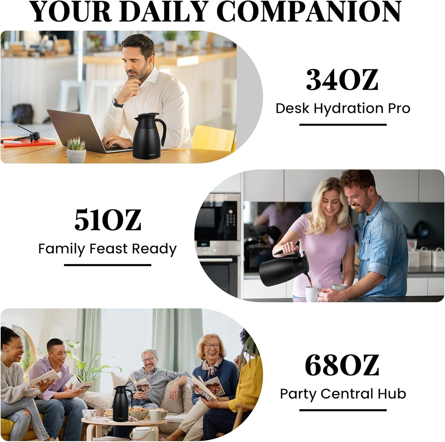 - Durable 304 Stainless Steel:Double-Stainless steel coffee carafe with double-walled 304 food-grade interior/exterior, odor-free. Non-slip base + scratch-resistant surface. Reusable thermos carafe for home/office