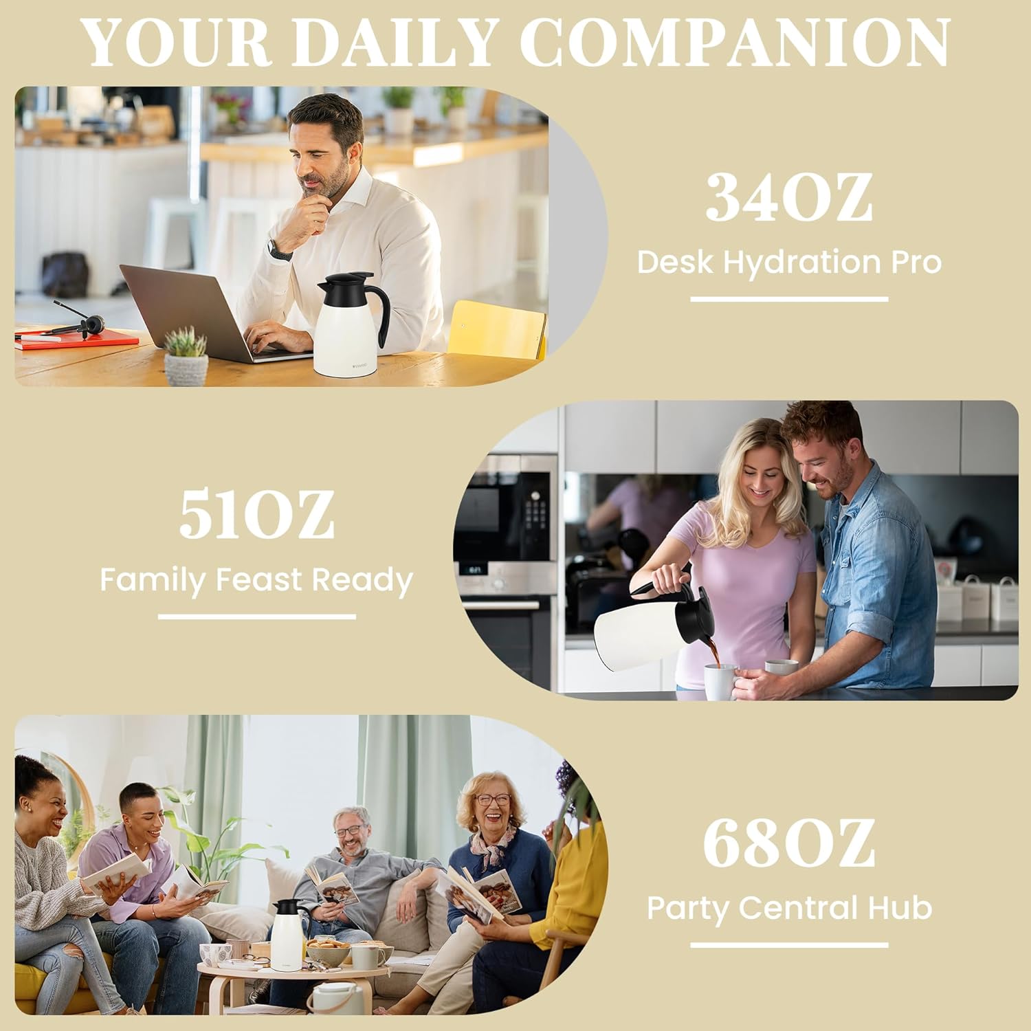 - Long-Lasting Vacuum Insulation: This thermal coffee carafe (68 oz / 2 L) uses advanced vacuum insulation to minimize heat transfer. Perfect coffee carafes for keeping hot drinks 12 hours or cold drinks 24hrs, ideal insulated coffee carafe for optimal retention