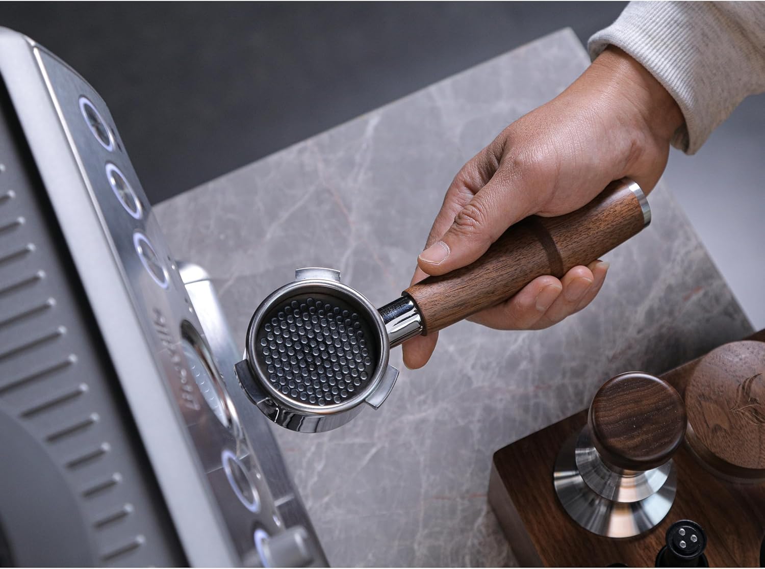 - Precision Walnut Naked Portafilter – The 54 mm naked portafilter is crafted with a solid walnut wood handle and high-grade stainless steel head. Offers unmatched visibility to monitor flow and diagnose channeling for advanced extraction control
