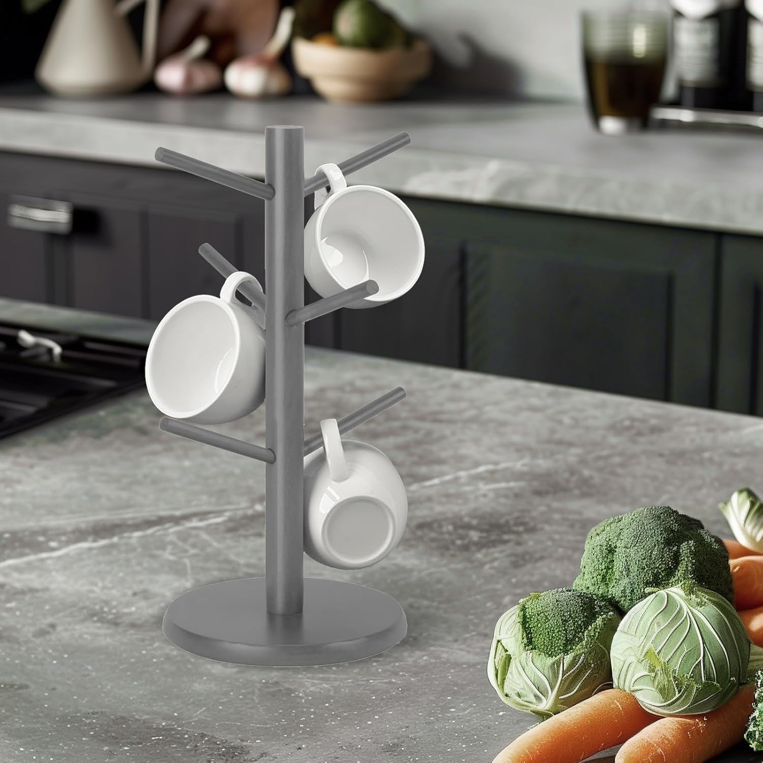 Wooden Mug Holder Tree, Coffee Cup Holder, Mug Organizer with 6 Hooks (Gray)