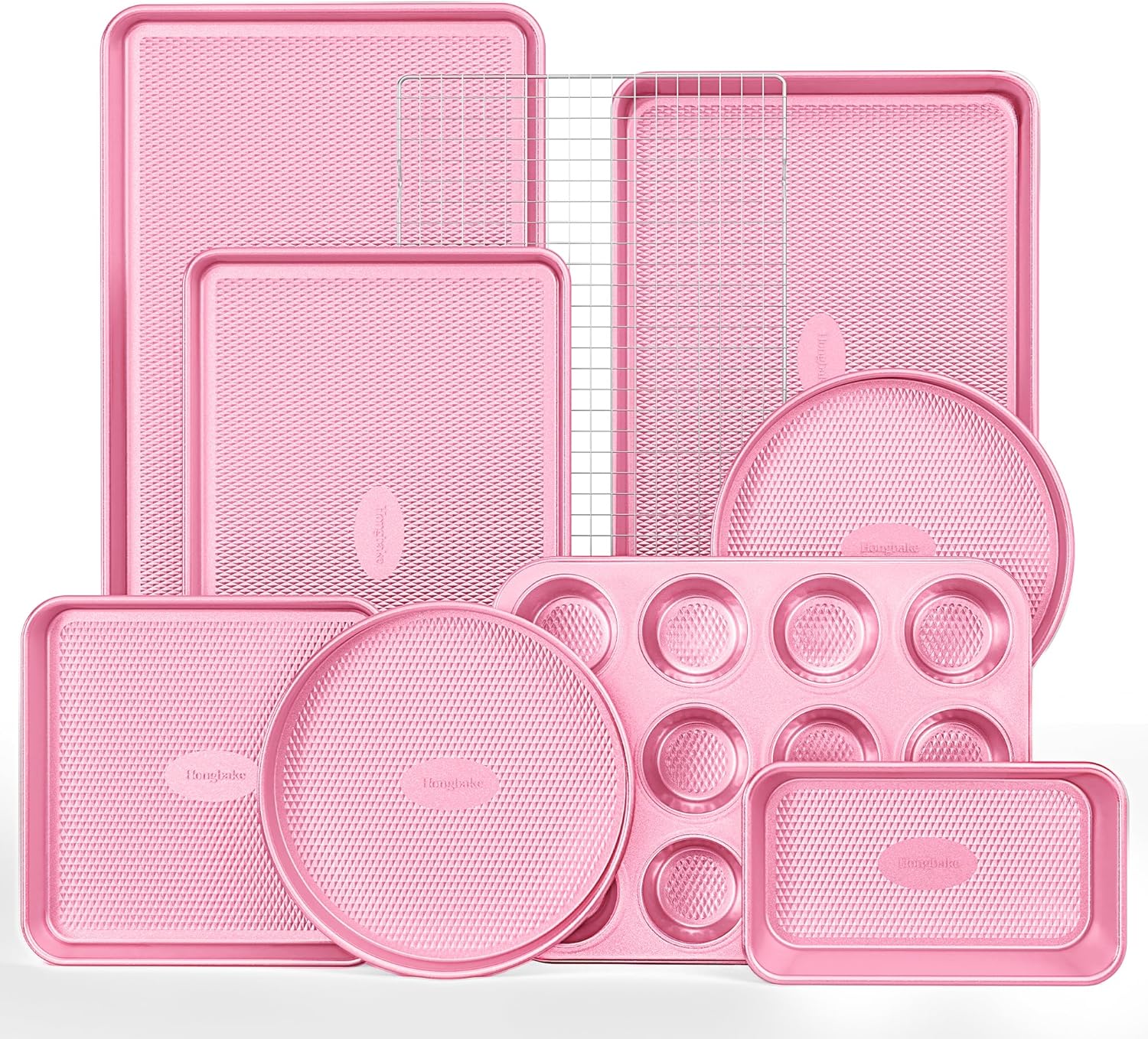 HONGBAKE 9-Piece Baking Pans Set Nonstick, Stackable Non Toxic Bakeware Sets with Diamond Texture, Oven Pan Set for Cooking, Includes Cookie Sheet with Rack, Cake Pan, Roasting Pan, Muffin Tin, Pink