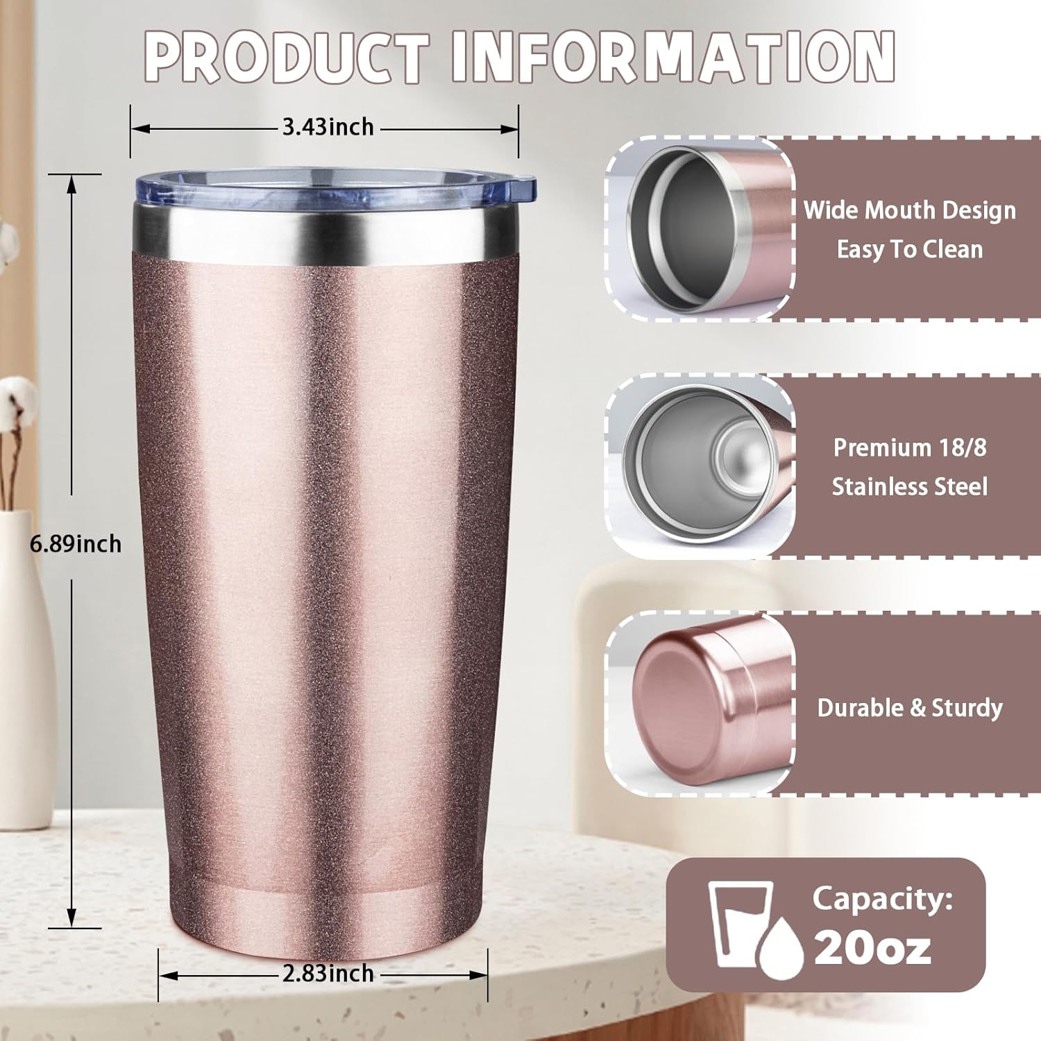- ✅【𝗗𝗼𝘂𝗯𝗹𝗲 𝗪𝗮𝗹𝗹 𝗩𝗮𝗰𝘂𝘂𝗺 𝗜𝗻𝘀𝘂𝗹𝗮𝘁𝗶𝗼𝗻】20 oz tumbler with straw is designed with double wall vacuum insulation that will not produce condensation and will keep your drink cold or hot for a long time. At room temperature, it can keep your drinks cold for up to 12 hours and hot for up to 8 hours.With a large 20 oz capacity, it can meet your daily or travel drinking needs and keep you hydrated at all times.