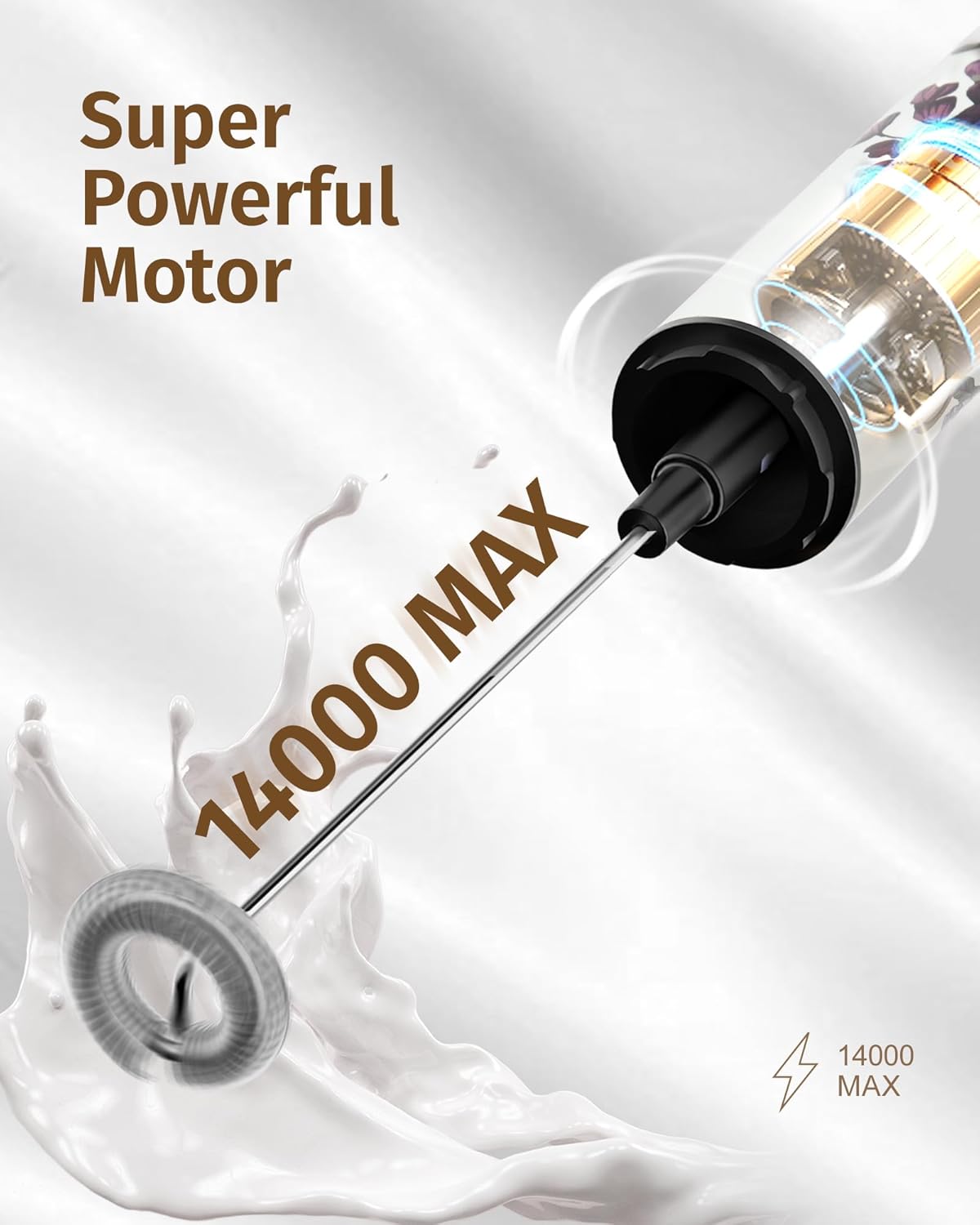 - Powerful Coffee Frother: Engineered by our expert team, it features a high-power turbocharged motor with a maximum speed of 13,000 RPM ±10%. It can whip up smooth, delicate coffee in just 15 seconds. For morning coffee enthusiasts, this elegant frother lets you top your coffee with velvety foam at lightning speed, even on the busiest mornings