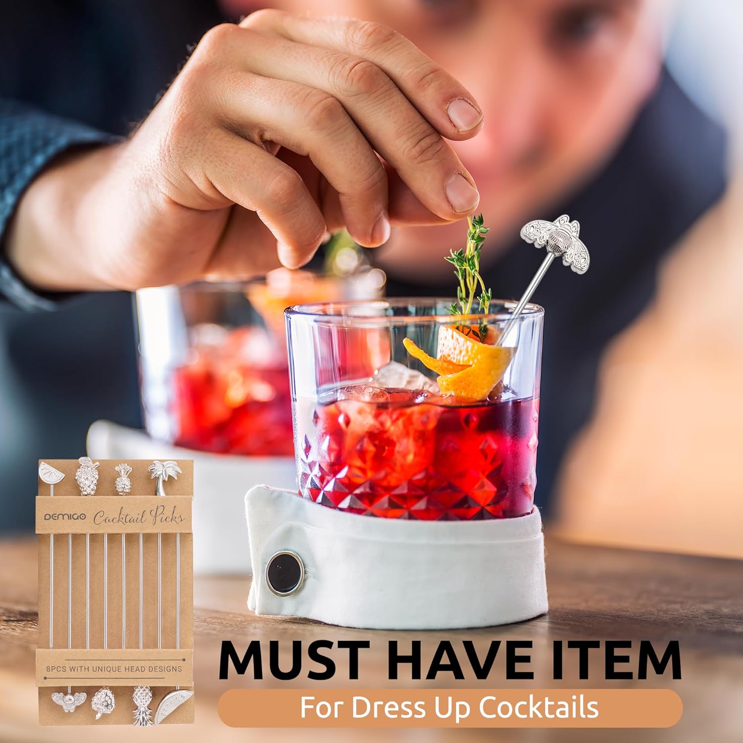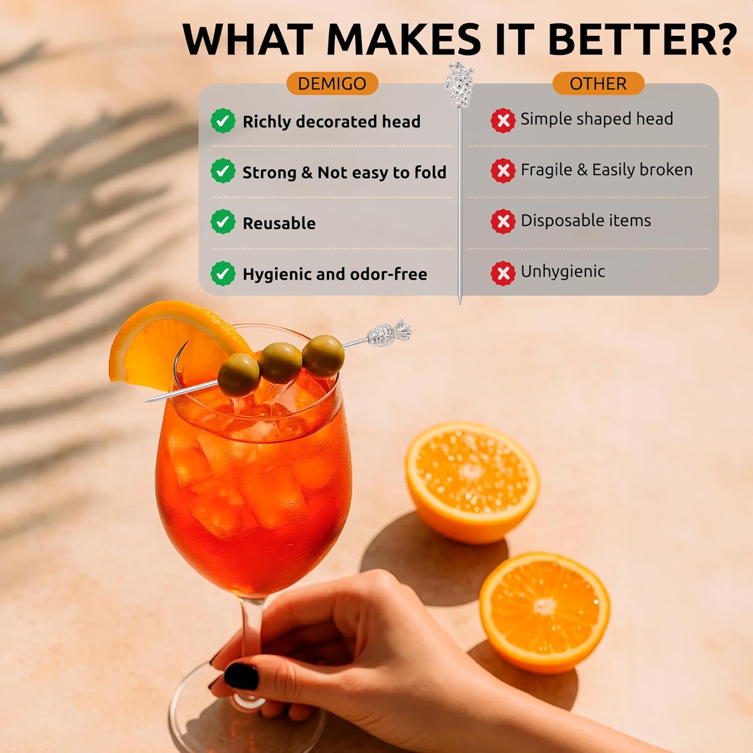 DEMIGO Fruit-Shaped Cocktail Picks, 8 Stainless Steel Reusable Skewers with Tropical Toppers - Olive Stuffers Martini Picks set Fruit Toothpicks Garnish Skewers Appetizer Drink Stick