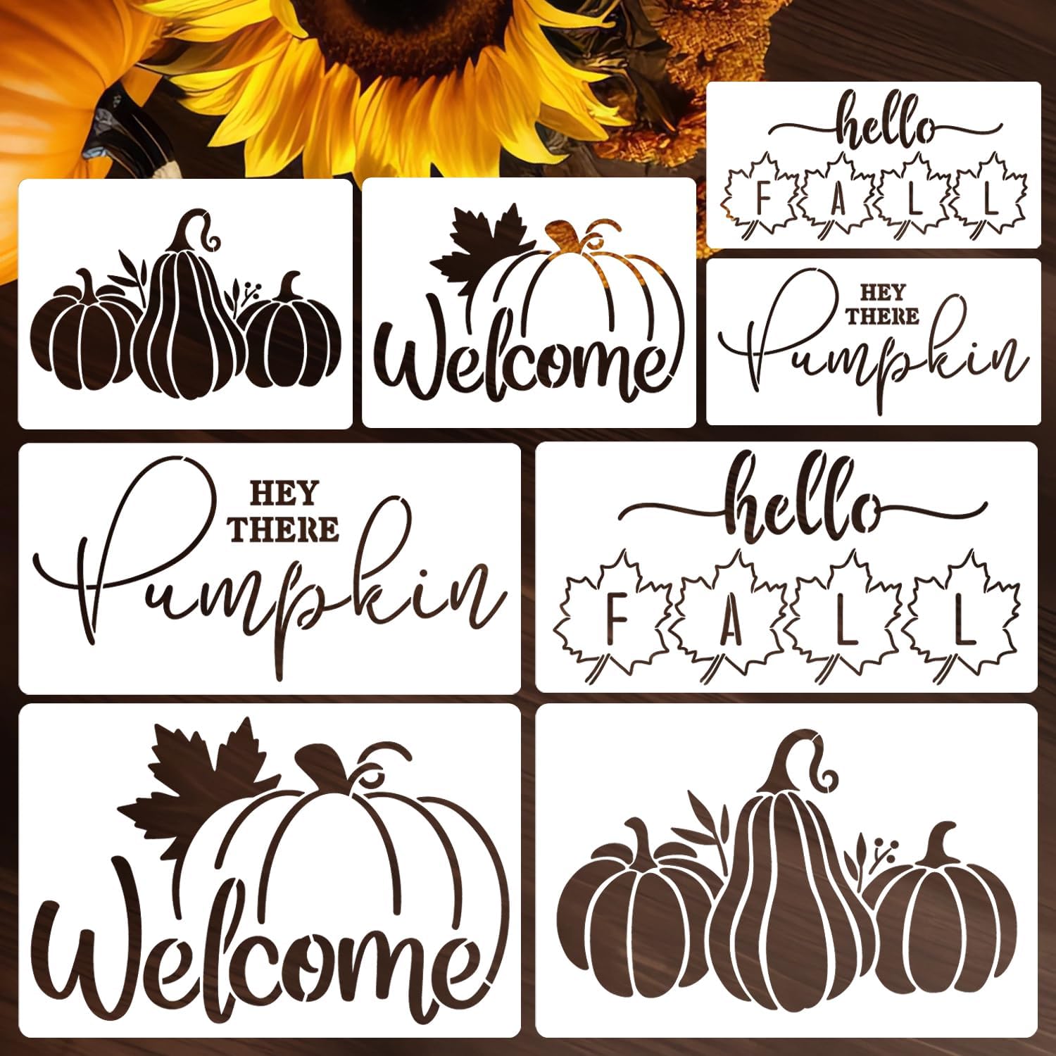 - Fall Stencils:4 Style fall stencils includes 2 different sizes from 8inch to 12inch.Patterns include pumpkins,hey there pumpkin,hello fall with maples and welcome pumpkins.