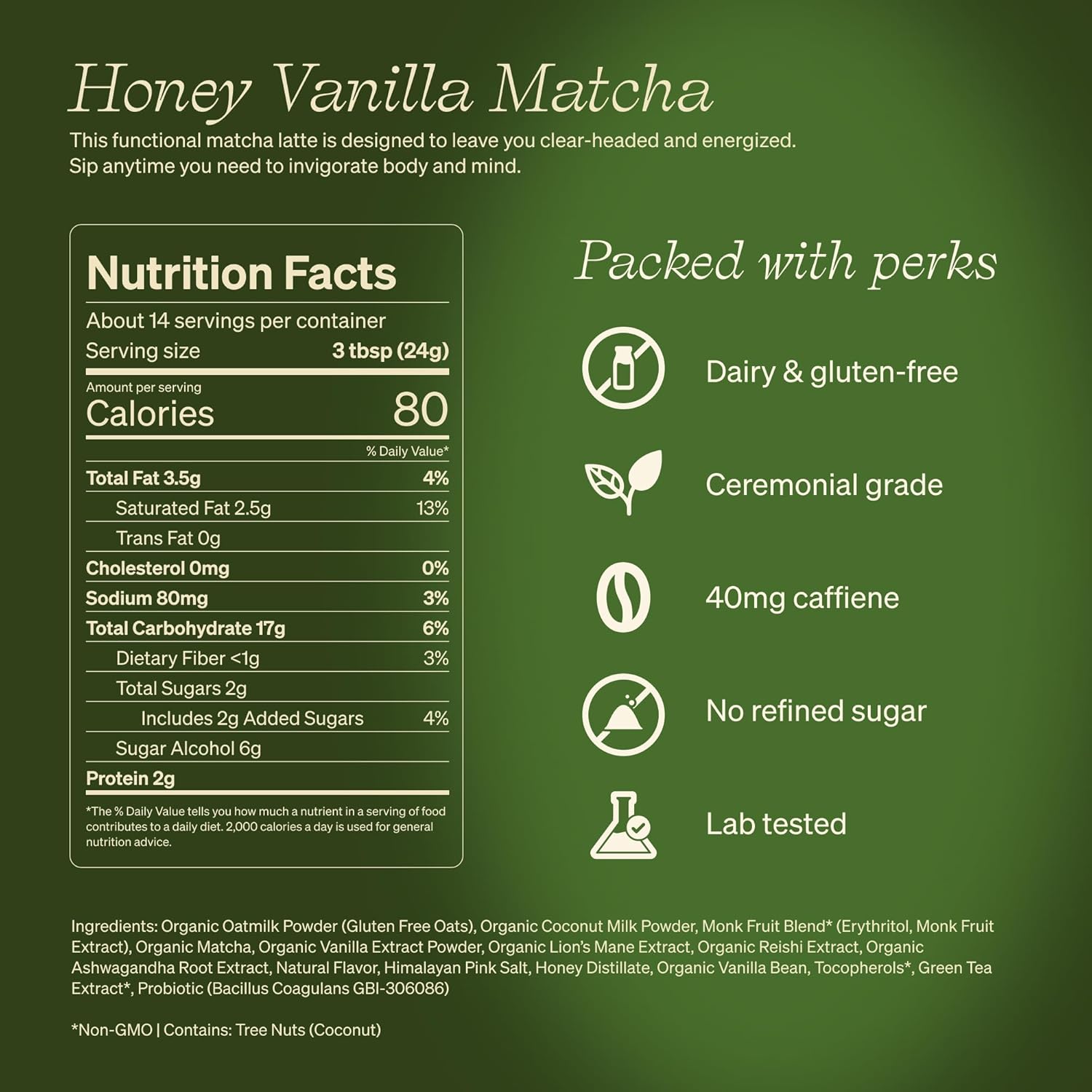 - FUNCTIONAL INGREDIENTS: Our organic matcha powder blends adaptogens, mushrooms, probiotics, and antioxidants. Probiotics support gut health, while adaptogens and mushrooms (Organic Lion’s Mane, Reishi & Ashwagandha) promote energy, positivity, and overall health. Matcha's EGCG firms and protects skin, chlorophyll supports clarity, and polyphenols help with tension.