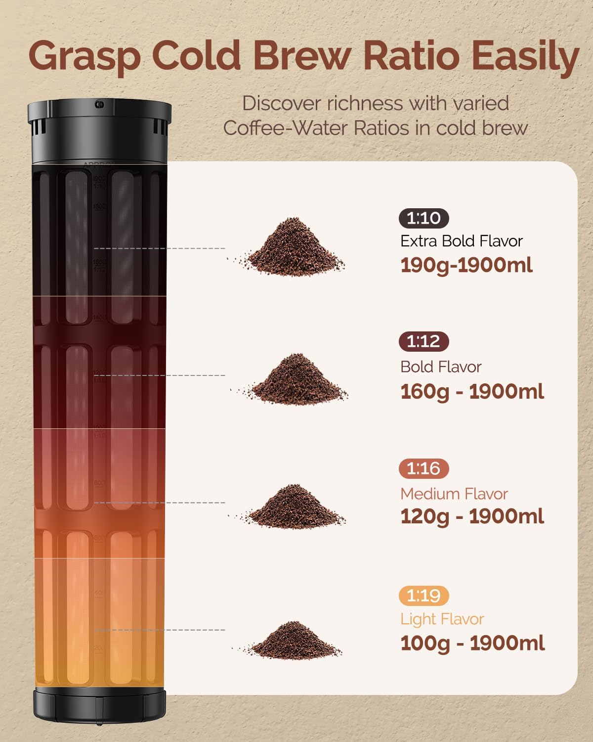 - Grasp Cold Brew Ratio Easily: Experience the art of precision brewing with our cold brew pitcher! When using 190g, 160g, 120g, and 100g of coffee grounds with the same time and water quantity, each ratio creates a distinct coffee concentration. Unlock the potential for customized cold brew strength, allowing you to savor the nuanced flavors according to your preference. Elevate your cold brew experience with our versatile pitcher.