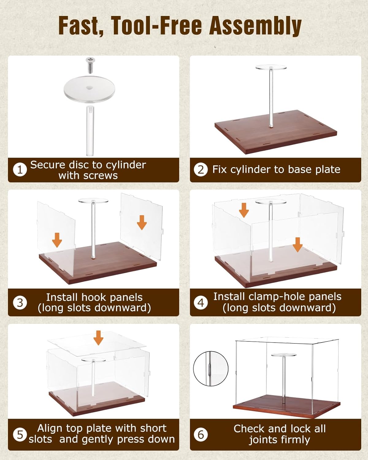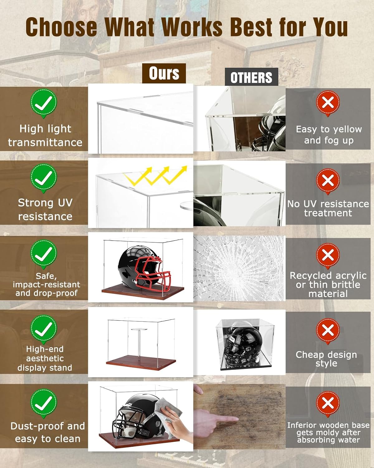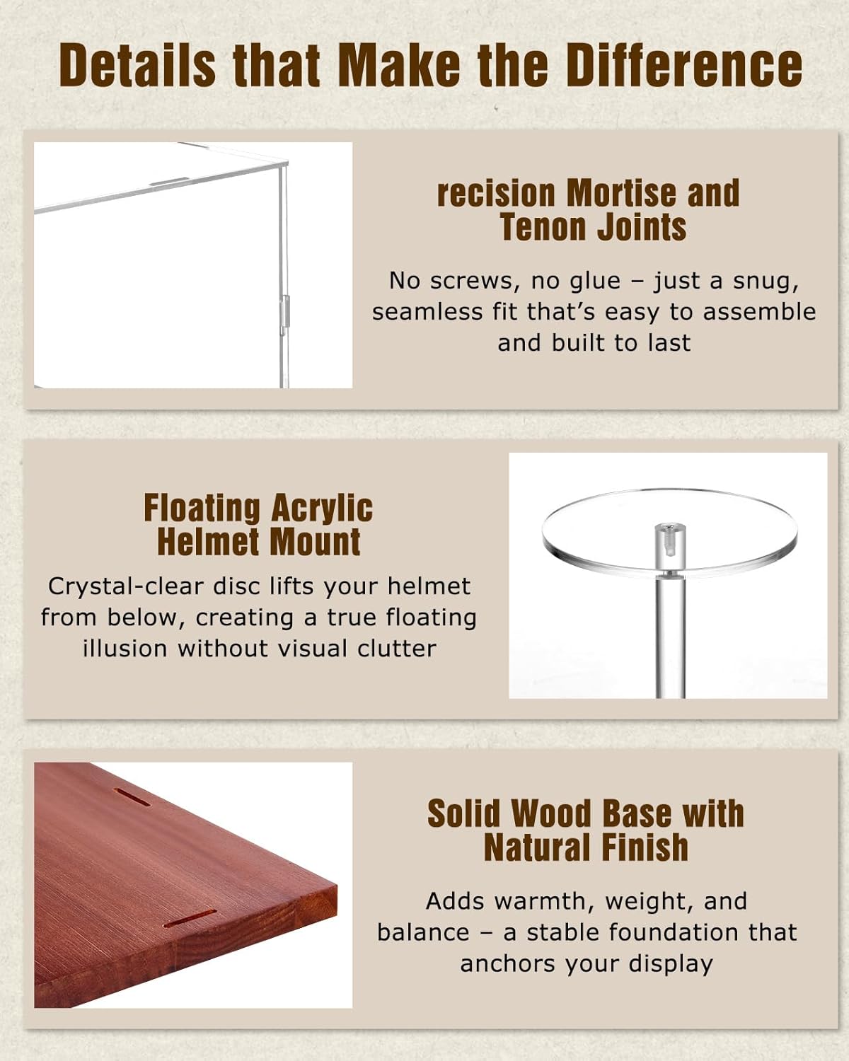 - High-Transparency Acrylic: Four-sided transparent acrylic panels offer 360° visibility, integrated with UV protection to shield collectibles from sun damage. Prevents fading and material aging, keeping helmets vibrant for years under any lighting conditions