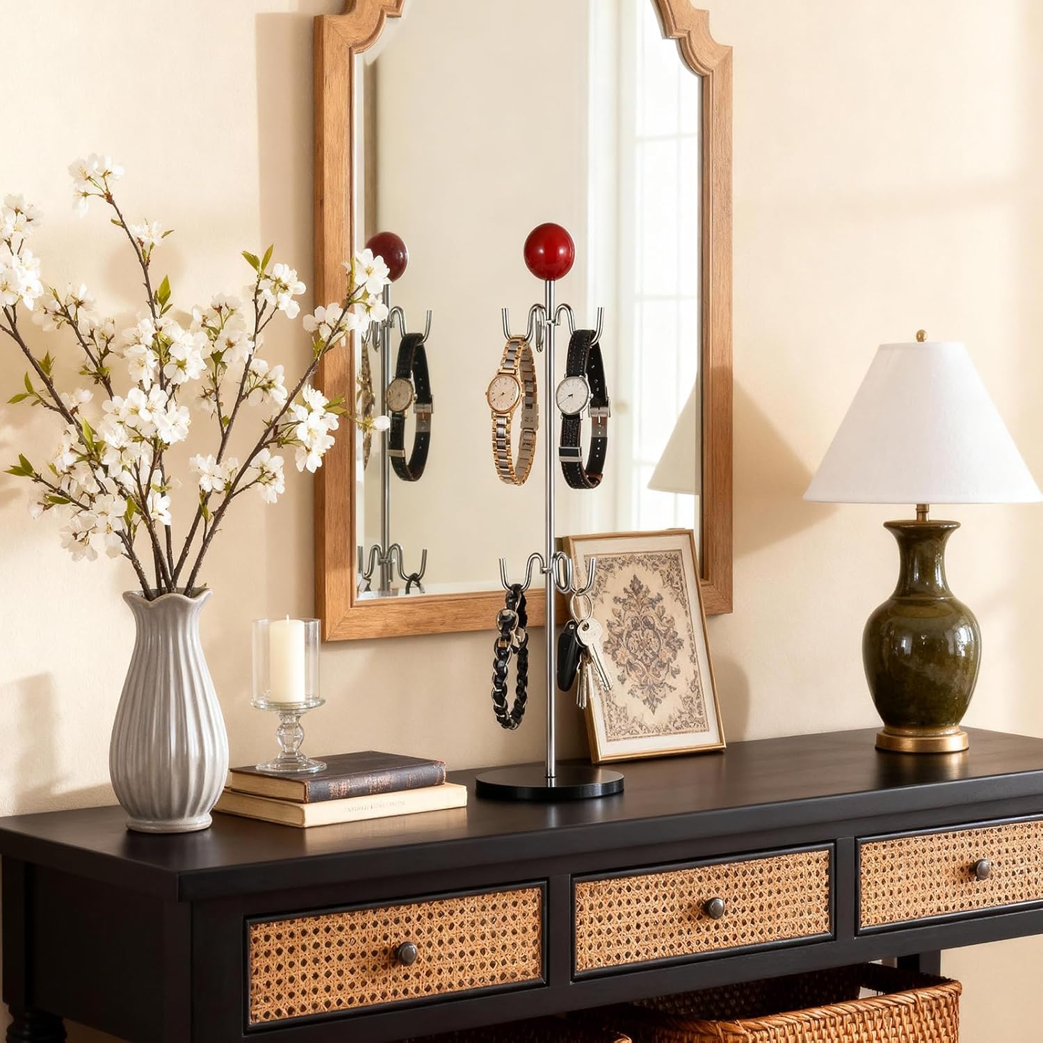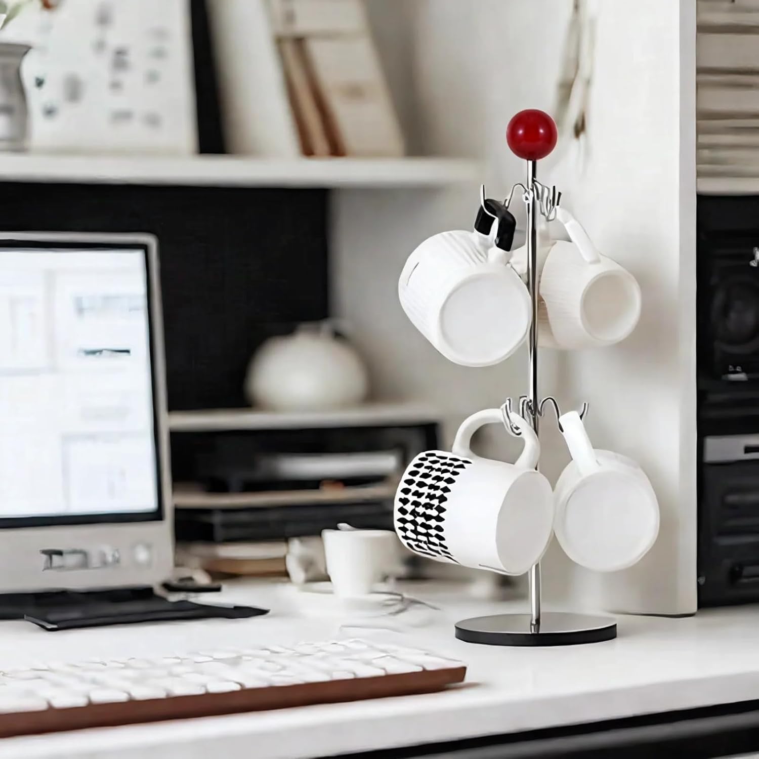 - Mid-Century Modern Design:Featuring a sleek arched handle topped with a lacquered wood ball,this coffee cup tree blends vintage charm with modern minimalism,elevating your coffee bar decor and turning practical storage into a stylish focal point