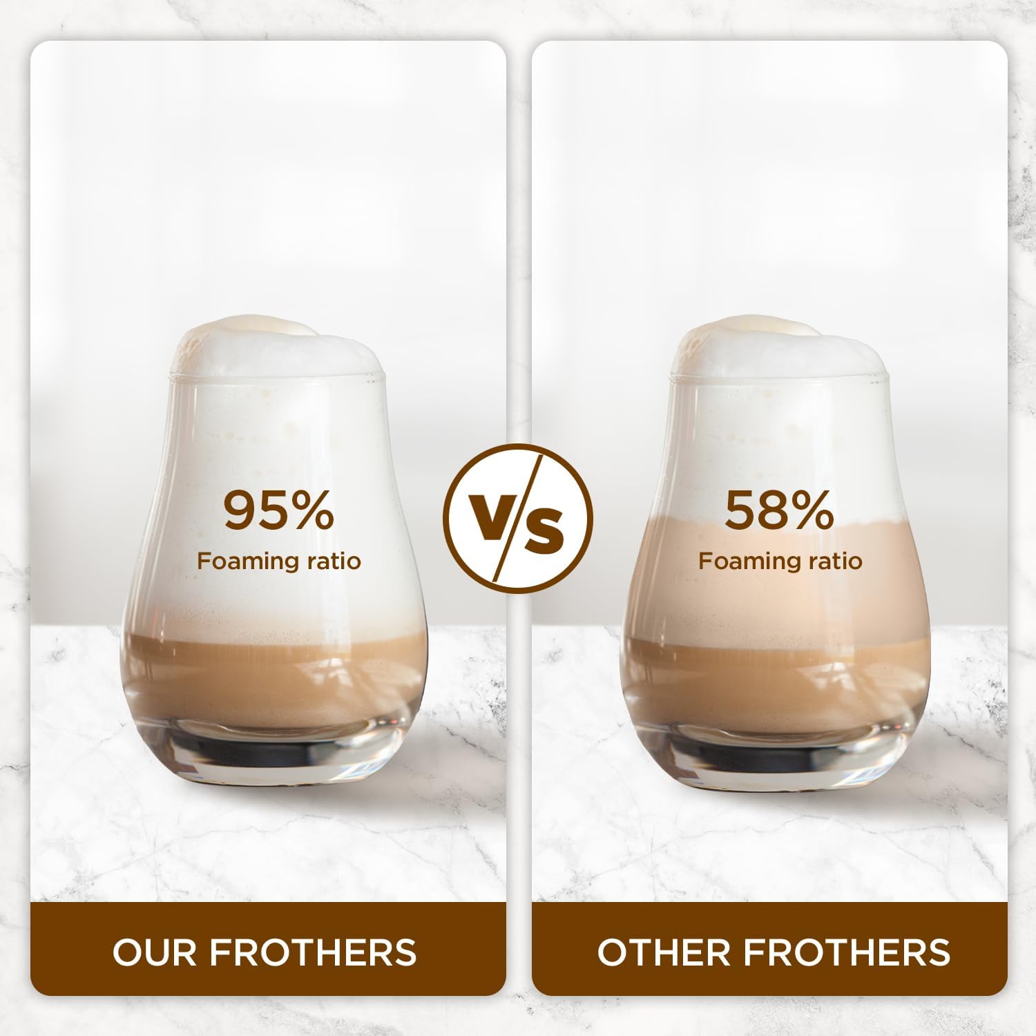 - 【Smart and Simple Operation】Our milk frother offers a range of features to enhance your coffee-making experience. With the touch of a button, you can create cold or hot fluffy foam for beverages like lattes, cappuccinos, macchiatos, and even non-coffee options such as matcha and milkshakes. Additionally, it can heat milk and stir hot chocolate to perfection, with a heating temperature of 85℃/185℉.