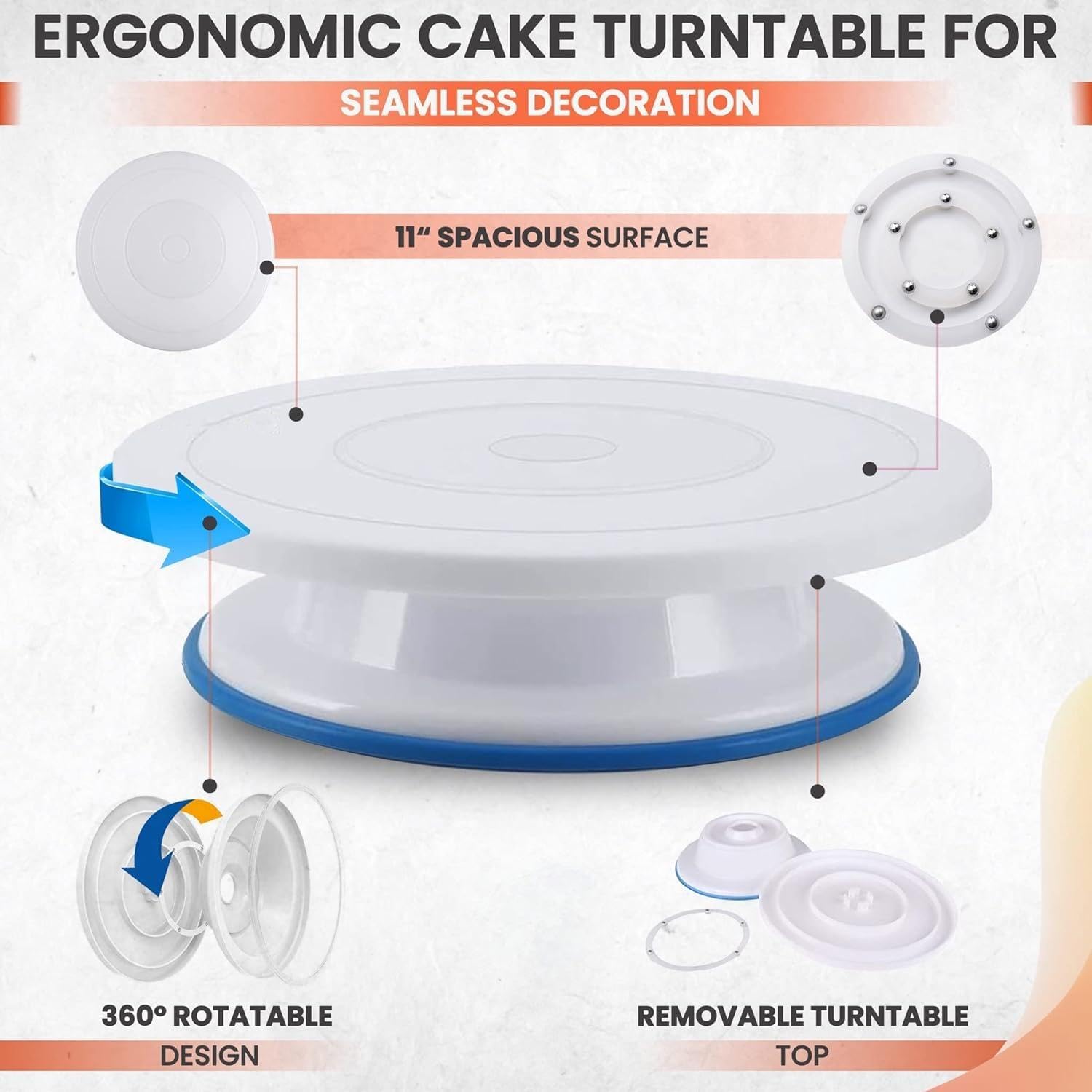 - 360° Spinning Cake Turntable: This essential baking supplies tool features a cake stand with an 11-inch diameter that spins smoothly on a hidden ball bearing allowing you to achieve stunningly consistent patterns and gorgeous designs. With 360º clockwise and counterclockwise rotation you can decorate cakes like a pro