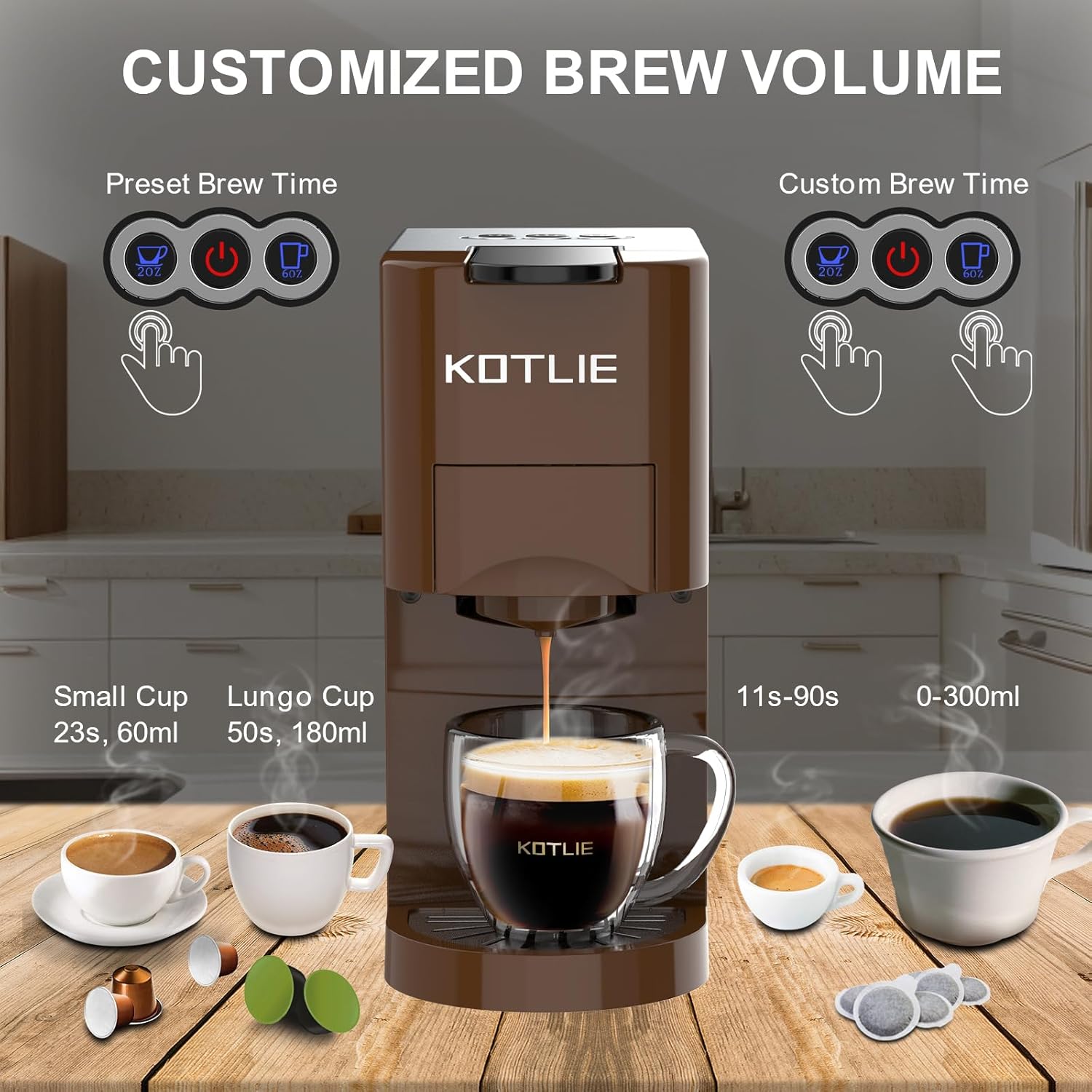 - 【4-in-1 Espresso Machine】The KOTLIE Espresso Machine comes with 4 kinds of pods that fits for K-Cup capsule/Nes*p Original/ground coffee/44mm ESE. It is also compatible with Dolc* G*sto Capsule/A MODO MIO capsule/Lav*azza Blue capsule/Caffitaly capsule (Separate KOTLIE PODS purchase required).