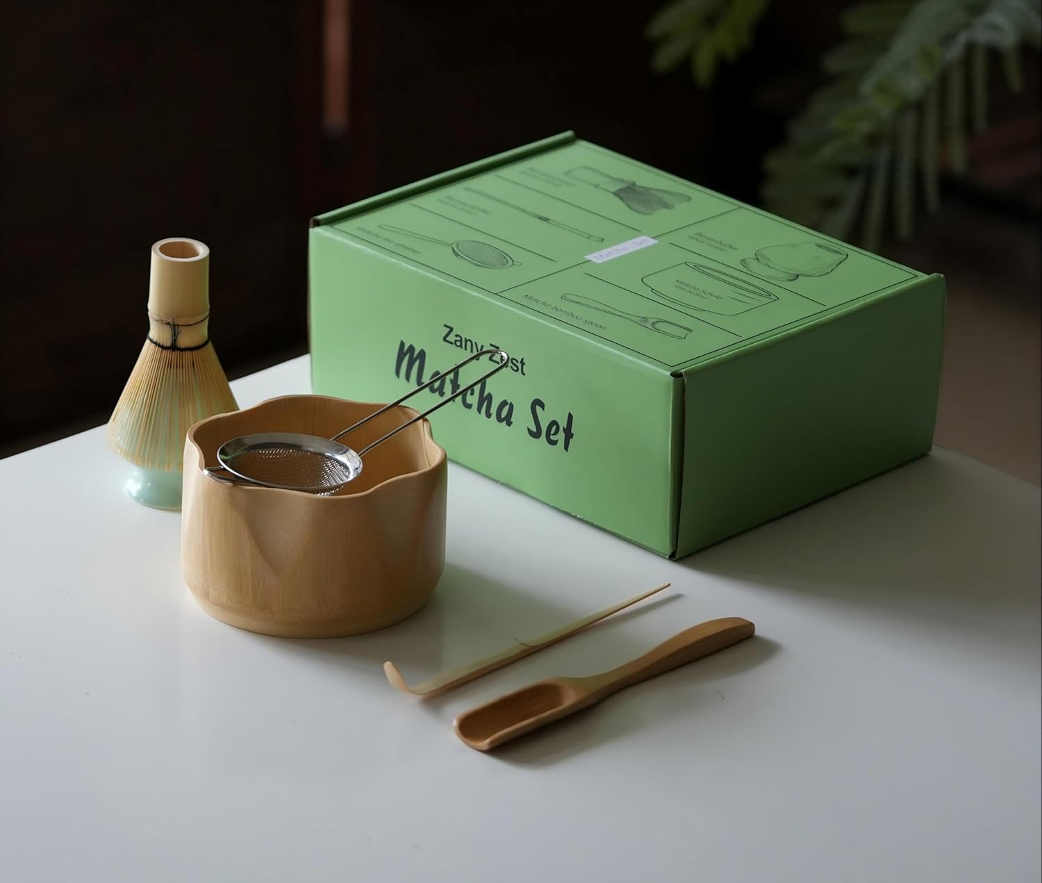 - - **Complete 6-Piece Set** =This all-inclusive Matcha Whisk Set comes with everything you need to prepare the perfect cup of matcha. It includes a bamboo matcha whisk, a bamboo scoop, a stainless steel sieve, and a unique 6-spout bamboo bowl, making it an essential collection for matcha enthusiasts.