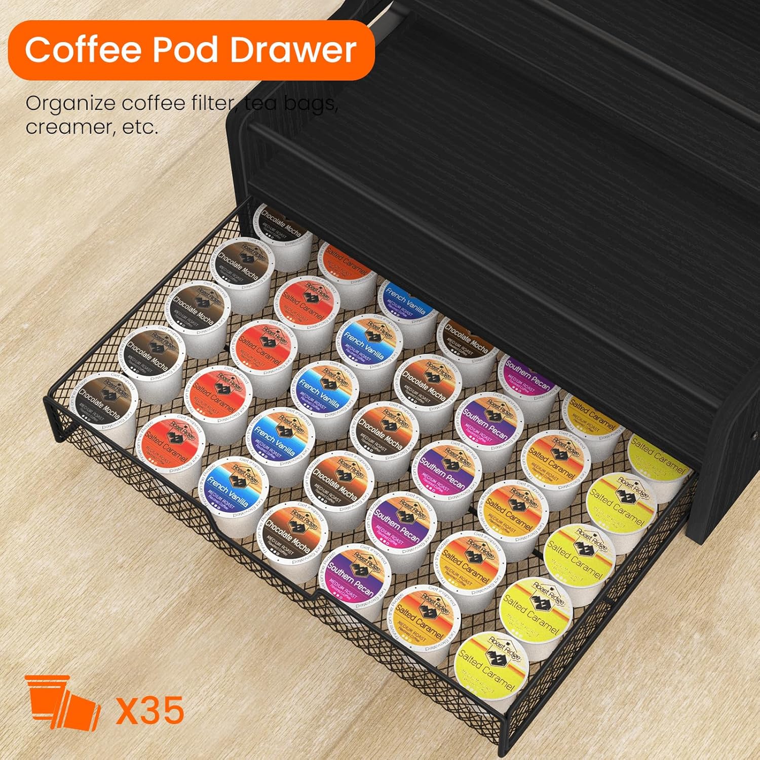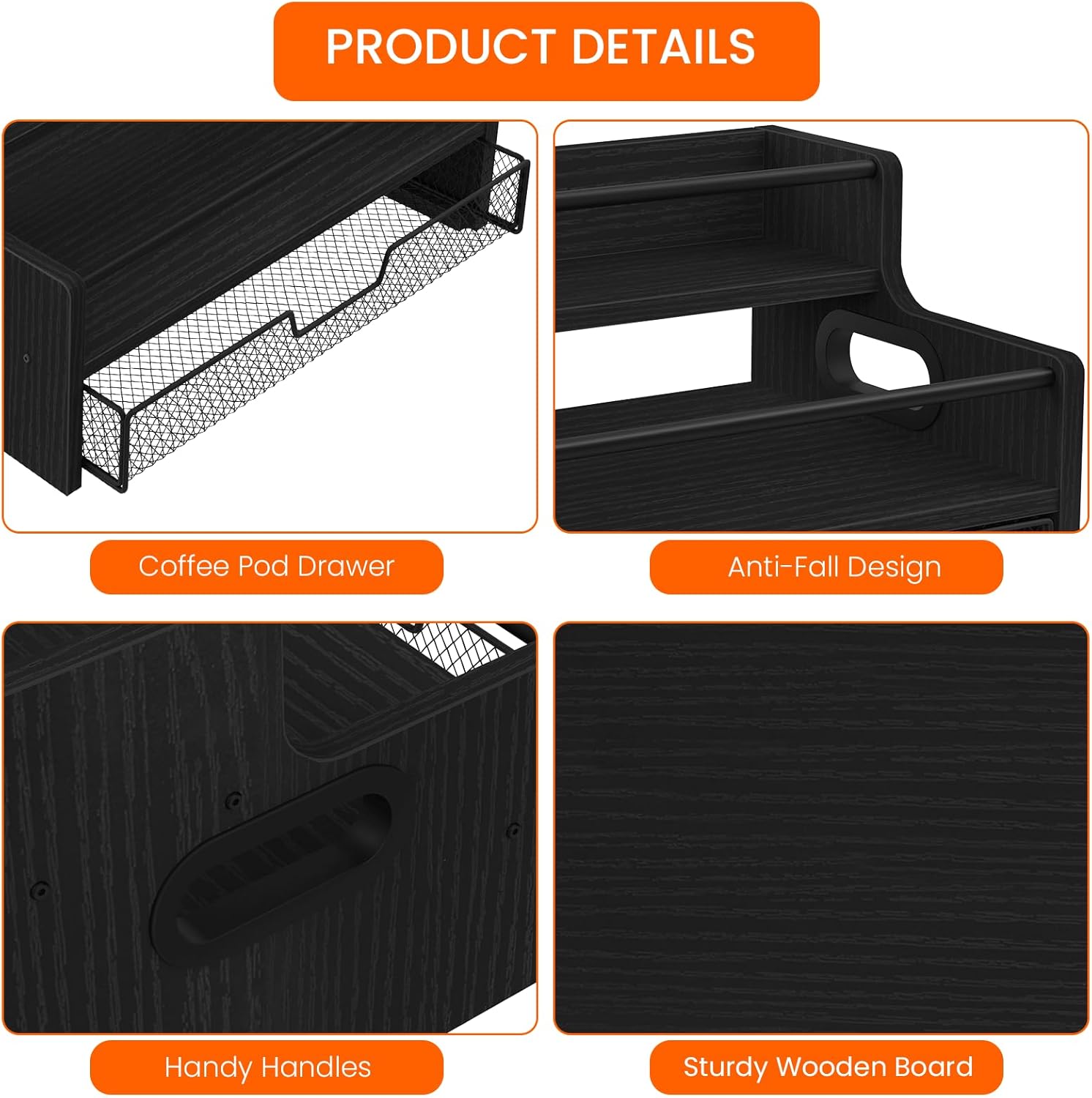 - Upgraded Coffee Syrup Organizer: This 3-tier coffee bar station combines vertical storage with a pull-out drawer. It holds 8 syrup bottles on stepped shelves and accommodates 35 coffee pods neatly tucked below. It takes up minimal space while maximizing vertical space. The compact design fits well in any countertop, desktop or café