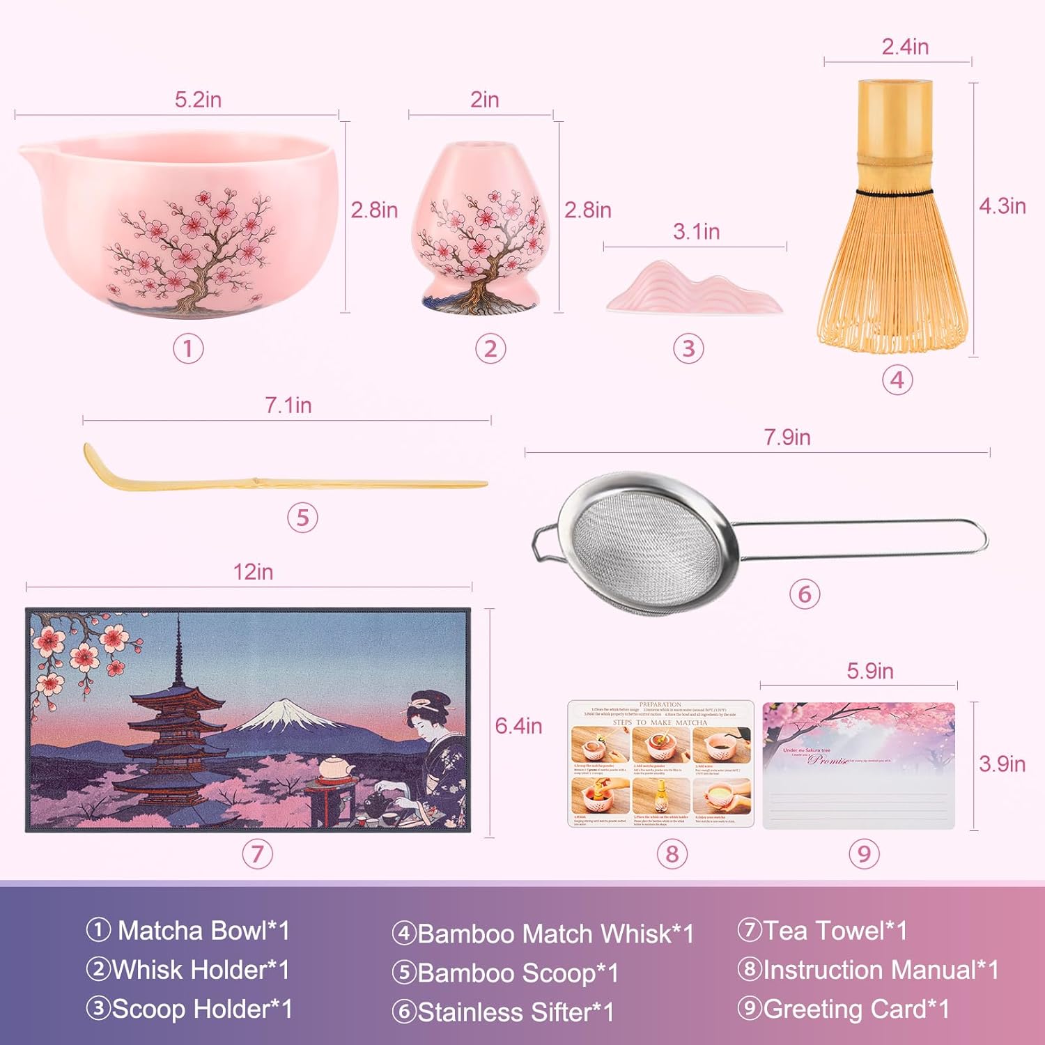 - 8-Piece Ceramic Matcha Making Kit: Everything you need for a matcha powder kit- Ceramic Matcha Bowl (Chawan)*1, Bamboo Matcha Whisk (Chasen)*1, Bamboo Scoop*1, Scoop Rest*1, Stainless steel sifter*1, Whisk Holder*1, Tea Towel*1, Greeting Card and a step-by-step handbook. Precision-crafted tools ensure effortless preparation, whether you're a novice or a tea master.