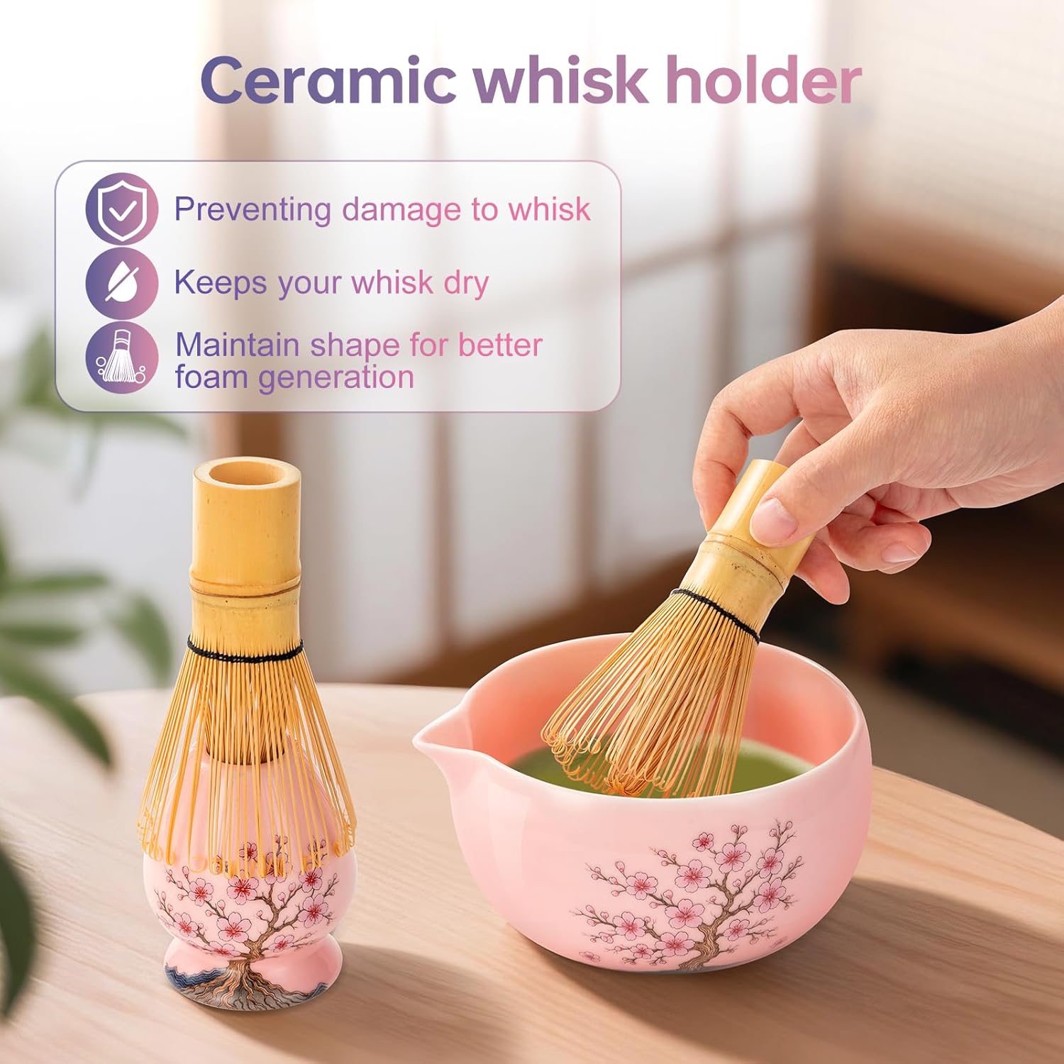 - Cherry-Blossom Matcha Whisk Set: Embrace the serenity of spring with pink matcha set whisk and bowl, inspired by delicate cherry blossoms. The ceramic matcha bowl with a pattern of graceful cherry blossom trees, the bottom of the matcha bowl is also printed with petals. Designed to double as a decorative centerpiece, it blends functionality with poetic artistry.