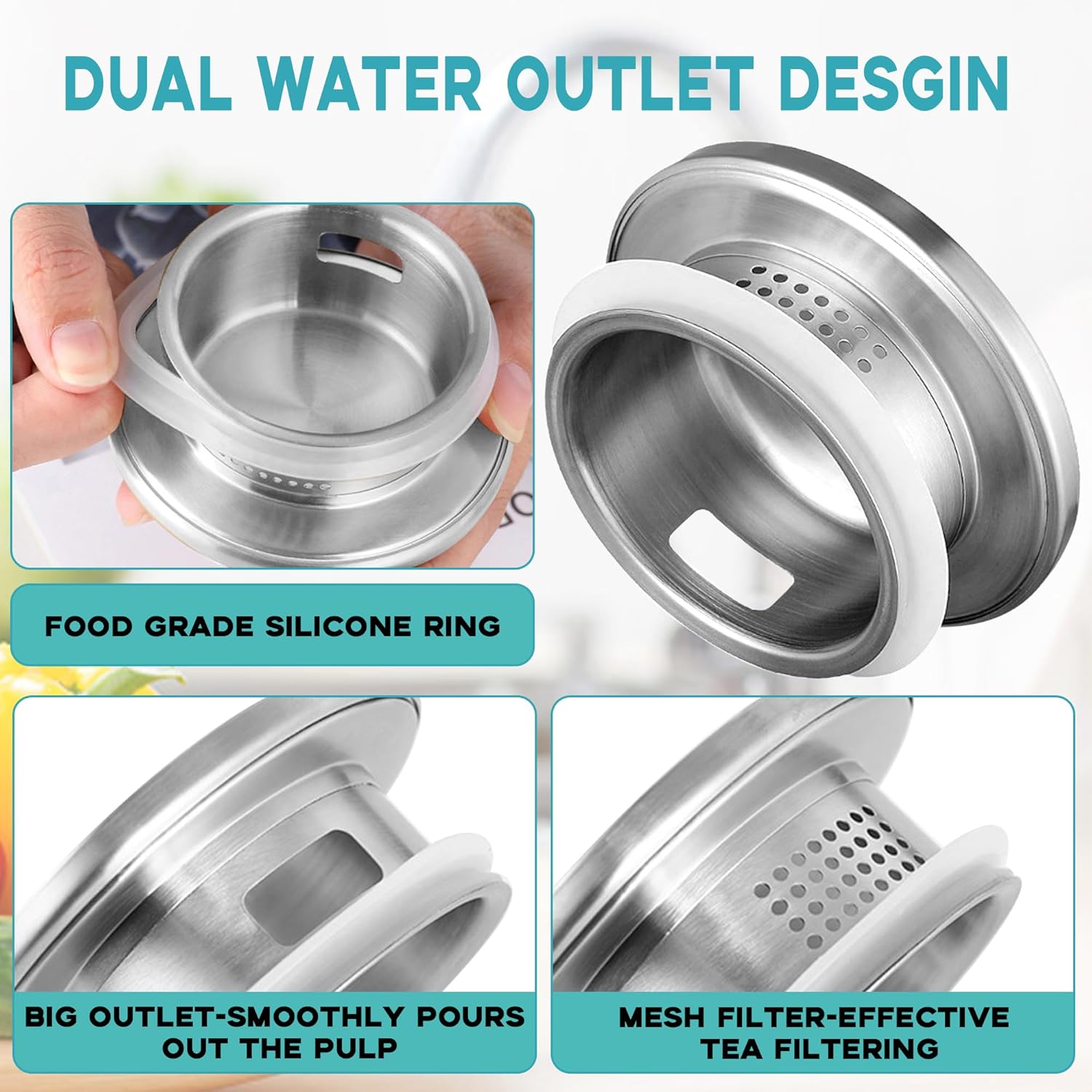 - Dual-Pour Stainless Steel Lid: Designed with a high-quality stainless steel top, the lid features two pour modes: a fine strainer for filtering fruit or tea, and a wide opening for fast pouring. It’s perfect for daily hydration or serving guests at dinner parties.