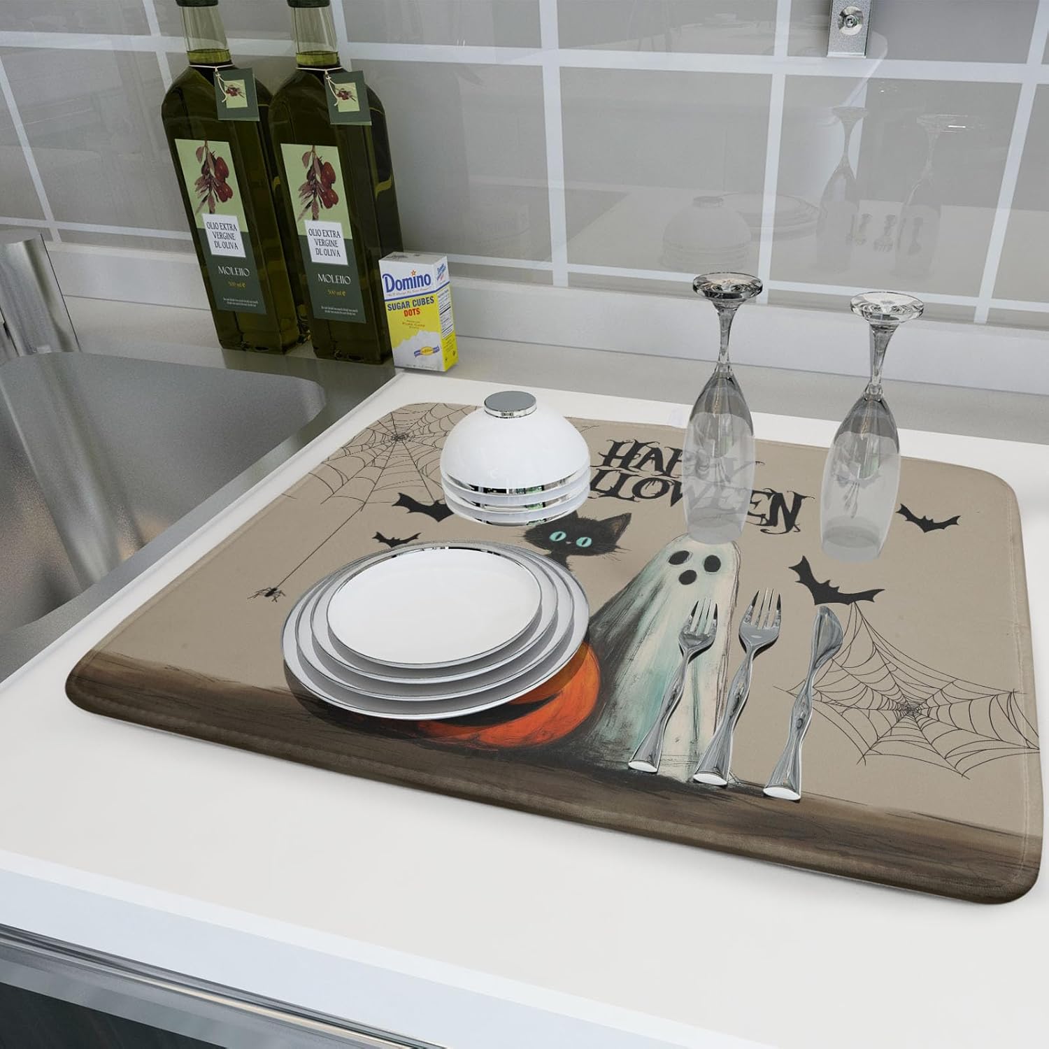 - 2【Widely Used】: The halloween ghost mats for kitchen counter countertop, coffee bar, dish drain rack, great for air drying dishes, glasses, silverware, pots, pans, fruits and vegetables. It's fade resistant and never stain your kitchen counter topand keep your counter dry.