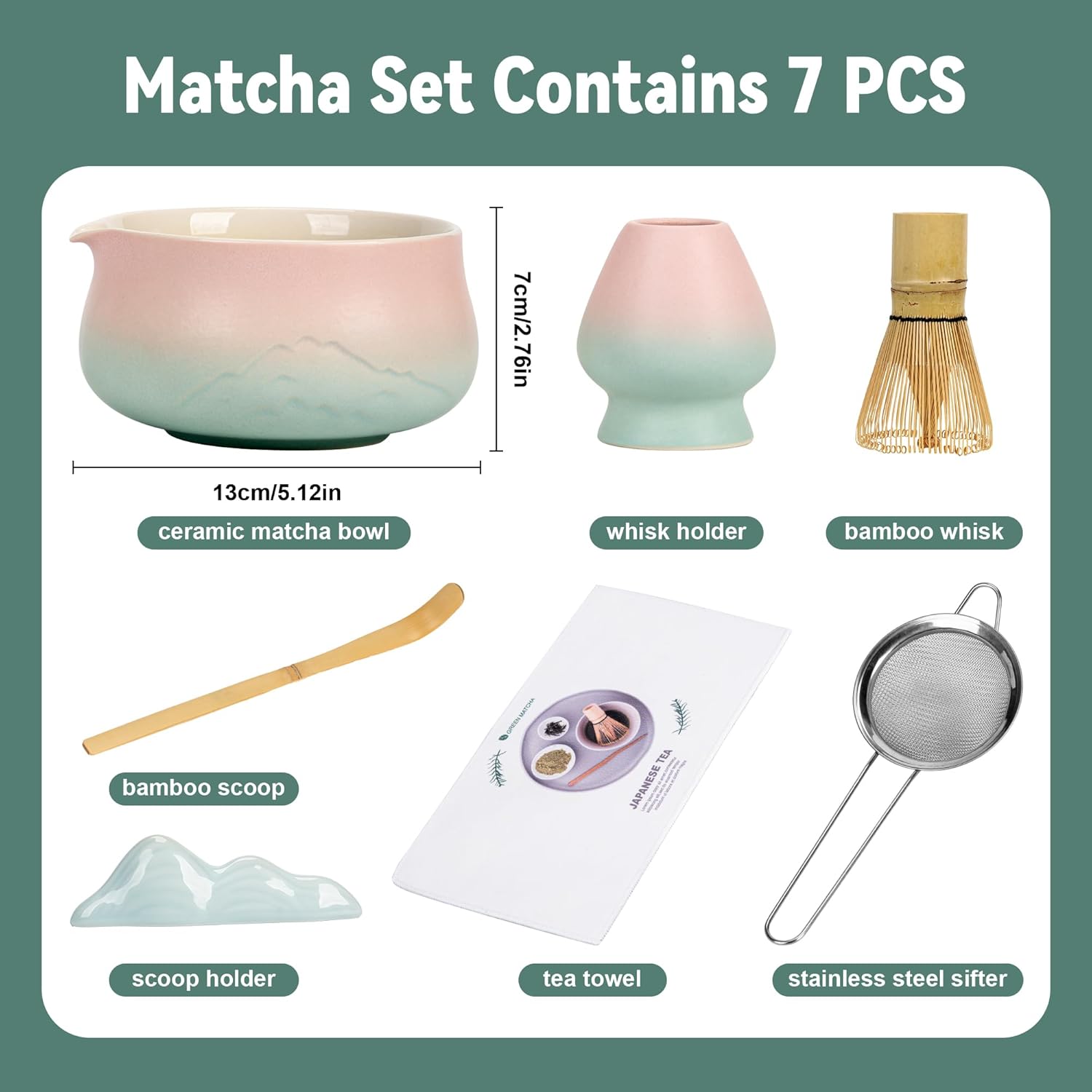 - 【7-PCS Matcha Set】:The matcha kit include 1 x blue&pink ceramic matcha bowl with spout,1 x whisk holder,1 x bamboo whisk,1 x bamboo scoop,1 x scoop holder,1 x stainless steel sifter,1 x tea towel. Heymirro matcha set is sure to impress any matcha lover.