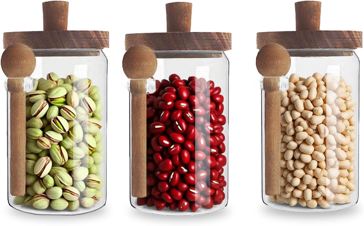 - Glass Jars with Wooden Lid & Built-in Spoon: The Glass Jars integrated spoon holder keeps your spoon clean, organized, and always within reach—no more searching through drawers! Just lift the spoon from its dedicated slot for quick, mess-free access to ingredients. In addition, the lids are easy-grip handle for comfortable opening and airtight freshness.