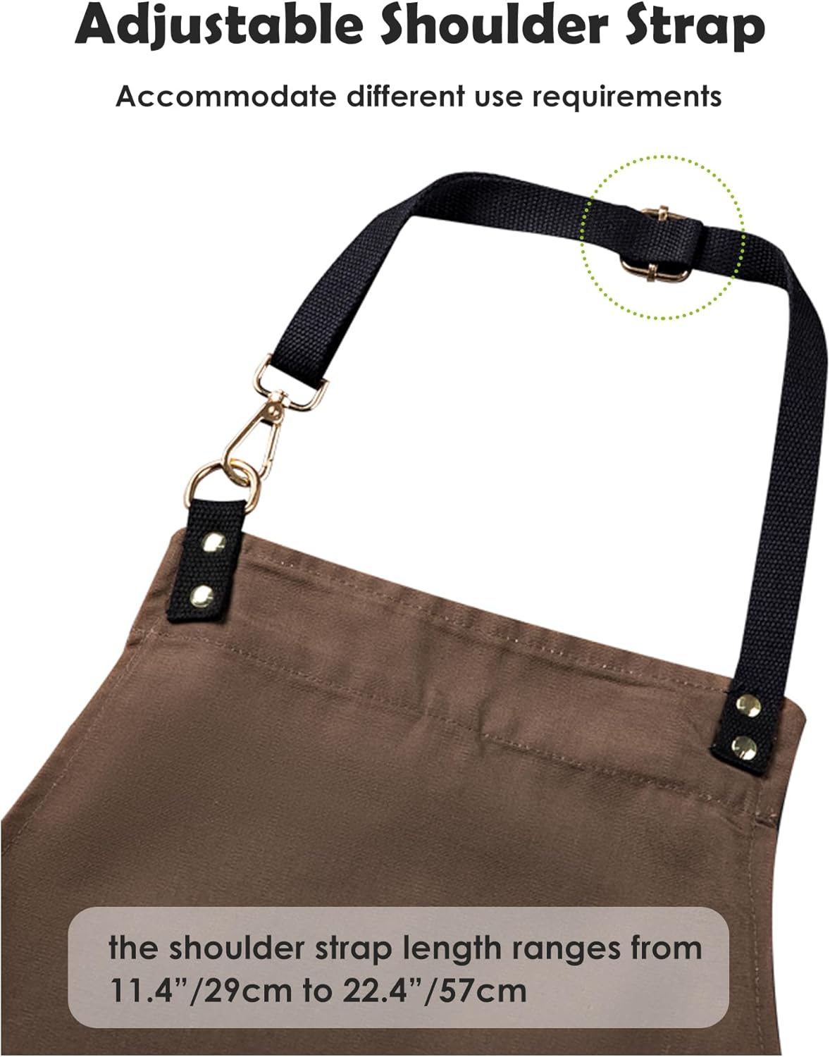 • Adjustable Chef Apron: Length: 29.5"/75cm; Width: 26.8"/68cm; Equipped with adjustable shoulder straps to accommodate different use requirements, the shoulder strap length ranges from 11.4"/29cm to 22.4"/57cm