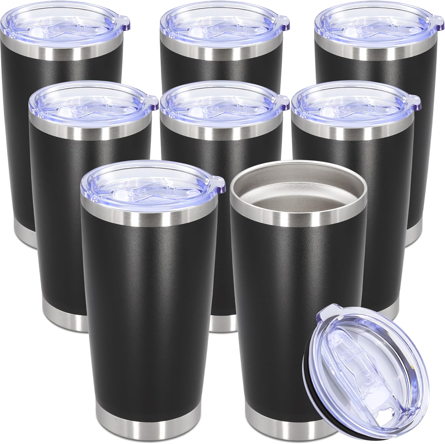 20oz Tumbler Bulk Stainless Steel Tumbler Cup with Lid Vacuum Insulated Double Wall Travel Mug, Durable Powder Coated Travel Coffee Tumbler Mug for Hot & Cold Drinks, Black,8 Pack