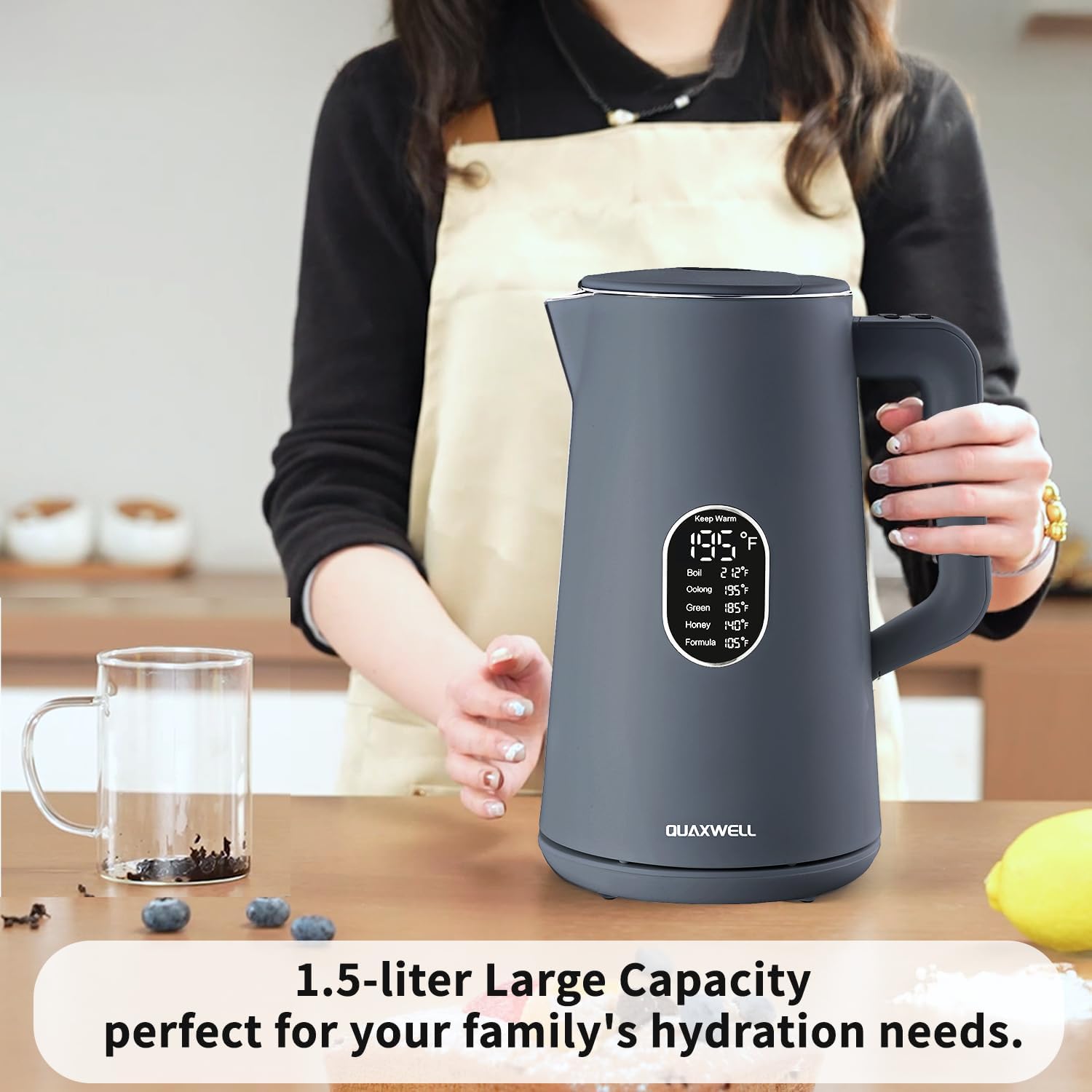 1.5L Electric Kettle Stainless Steel, Double Wall Cool Touch Teapot, Fast Boil,5 Temperature Control, LED Display, Auto Shut-Off, BPA-Free,Keep Warm Function, Ideal for Tea & Coffee,Gray