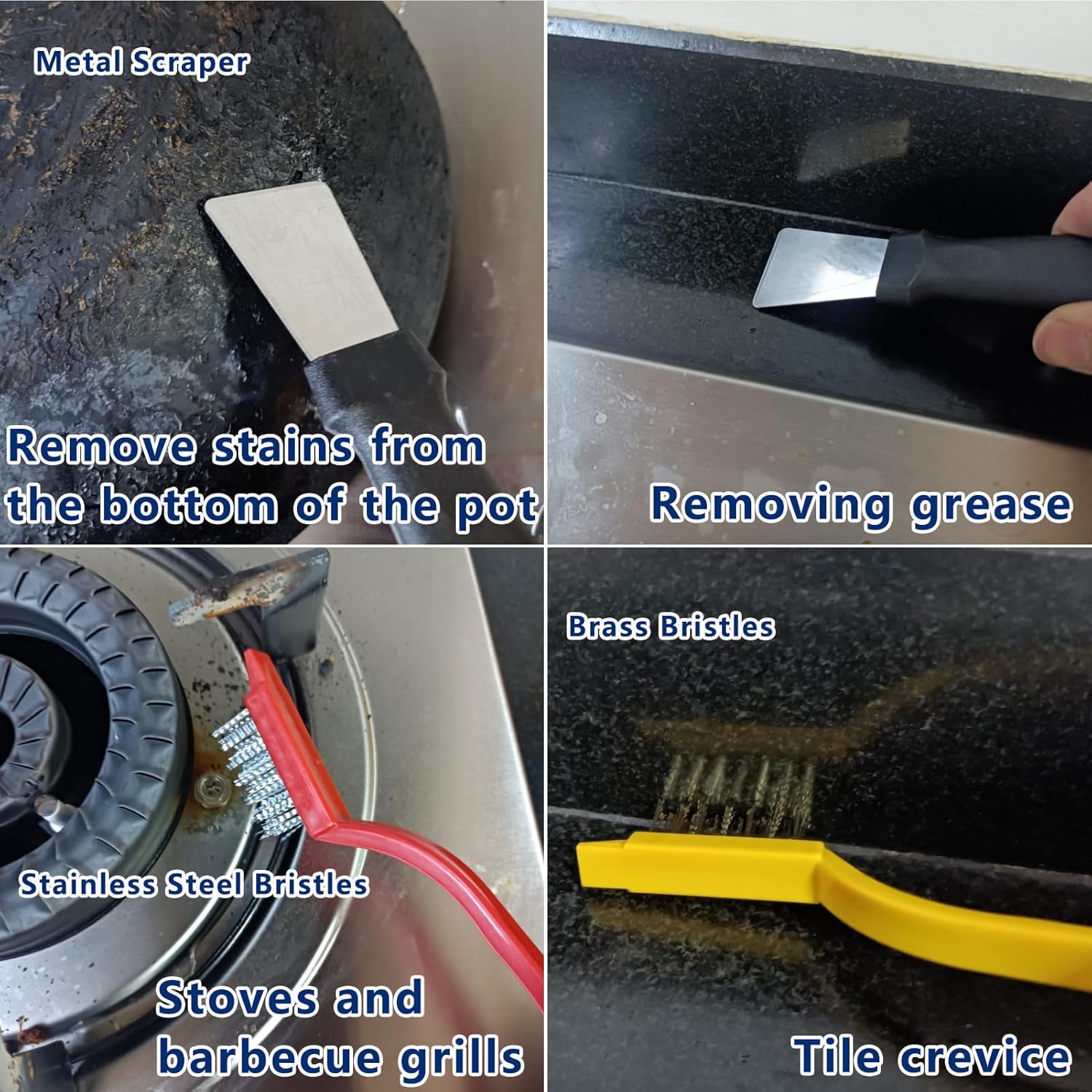 - 12-Piece Comprehensive Cleaning Set: This kit includes 12 practical tools: 6 colorful stiff-bristle gap brushes, 3 professional brushes of varying hardness (heavy-duty brass brush, descaling stainless steel brush, delicate nylon brush), 2 versatile kitchen brushes, and 1 scraper. Ample quantity tackles all kinds of stubborn grime, empowering you to easily handle any cleaning challenge.
