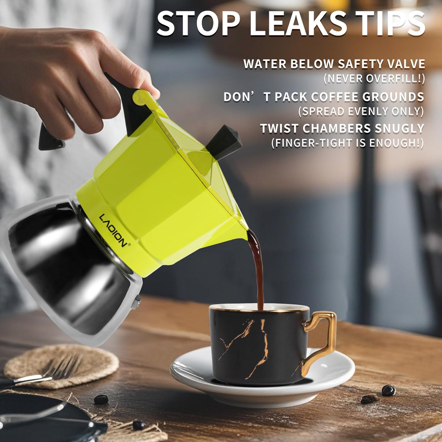 - 【Quick Tips to Prevent Leaks】1.When adding water, NEVER fill past the safety valve - this is the #1 cause of spills. 2.For coffee grounds, just spread them evenly - don't pack or overfill. 3.Before brewing, always twist the top and bottom chambers until snug (finger-tight is enough!). These simple steps keep your moka pot leak-free. Happy brewing!