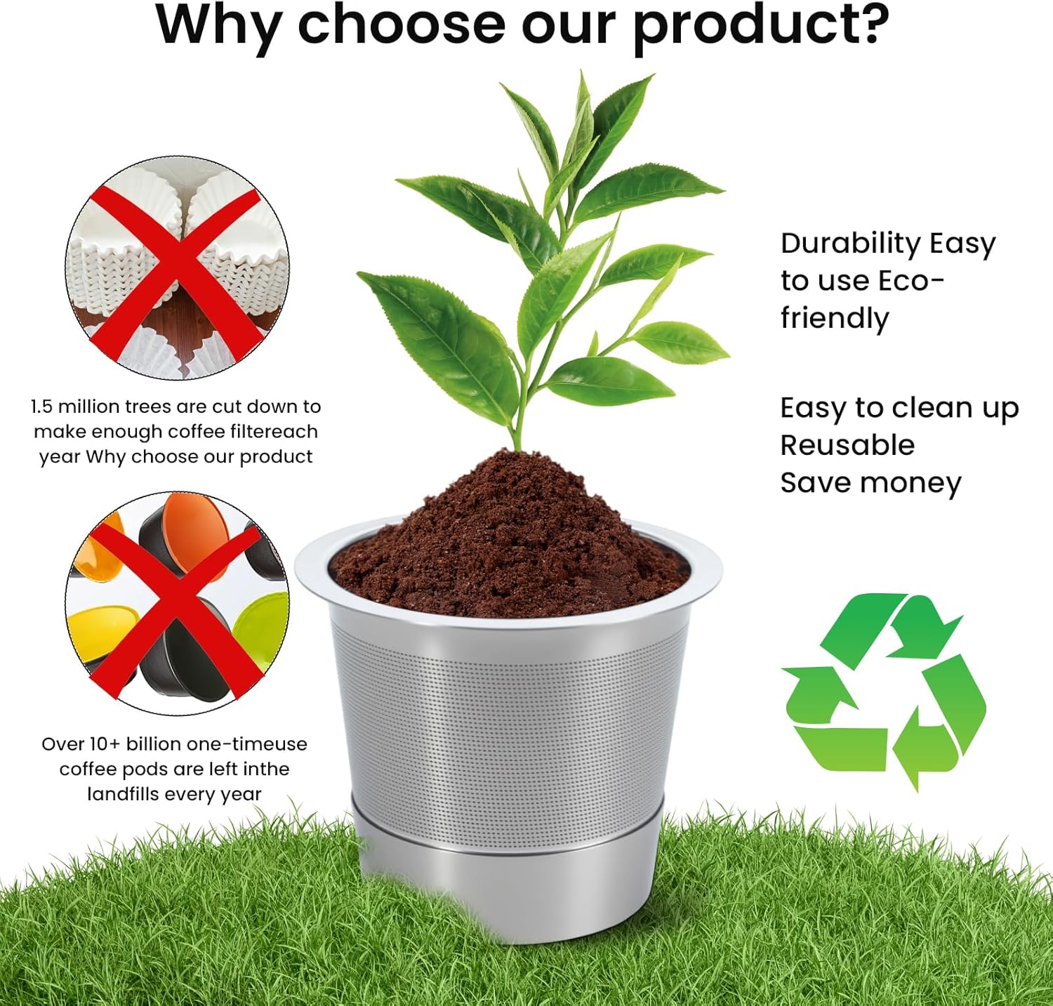- 1. Food-Grade Stainless Steel: Safe, Durable & Eco-Conscious Health & Safety: Made with 304 food-grade stainless steel, resistant to high temperatures and corrosion, eliminating risks of harmful plastic leaching. Zero-Waste Mission: Replaces single-use plastic pods—reusable 5,000+ times, saving hundreds of K-Cups from landfills annually. Easy Cleaning: Fully disassemblable design; dishwasher-safe (handwash recommended for the mesh filter).