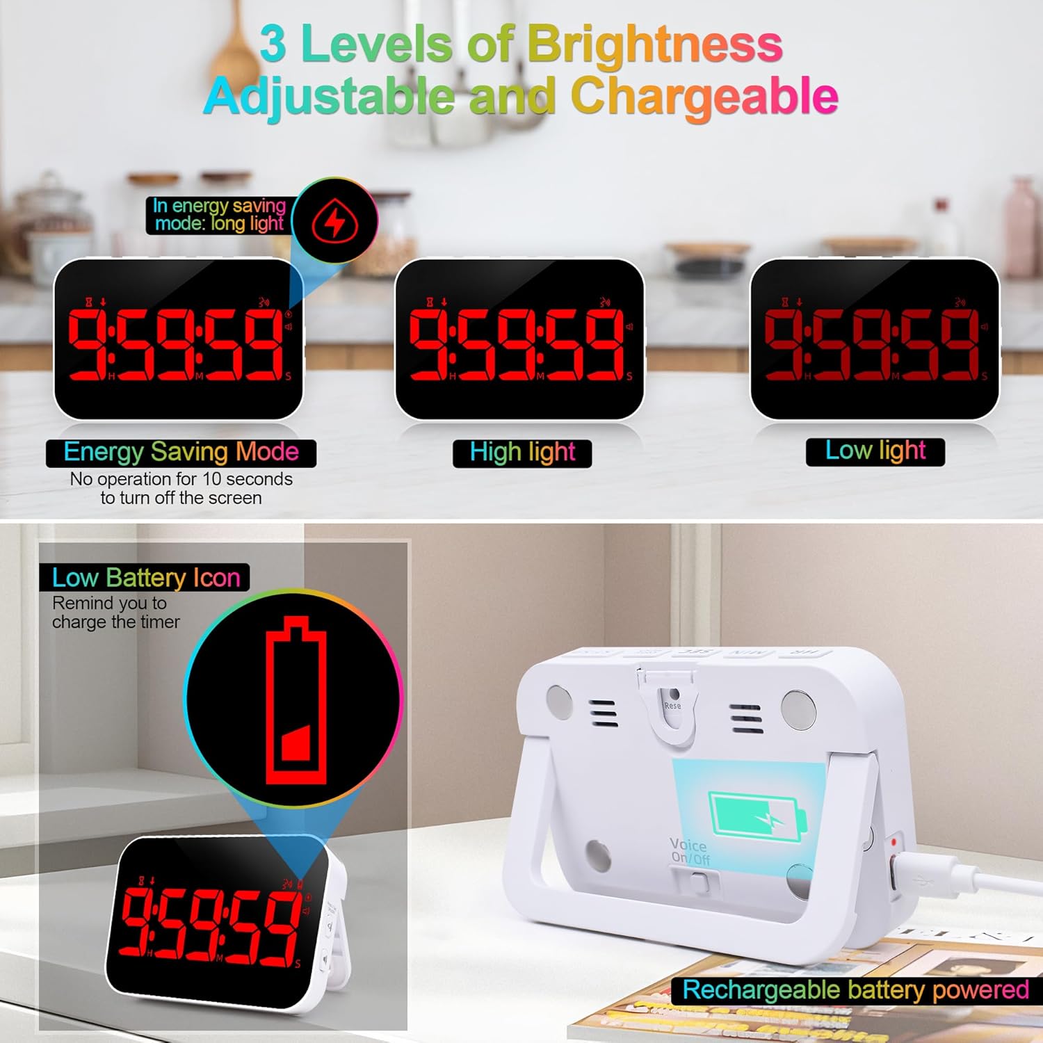 - TIMER WITH VOICE ANNOUNCEMENT REMINDER: Our cooking timer for kitchen has a voice on/off button on the back, when turned on, This timer will sound an audible reminder at 15 min, 10 min, 5 min, 1 min and the last 10 s, which can help you better control the time and progress when cooking. This voice reminder timer is more convenient and practical for the elderly or users with poor eyesight