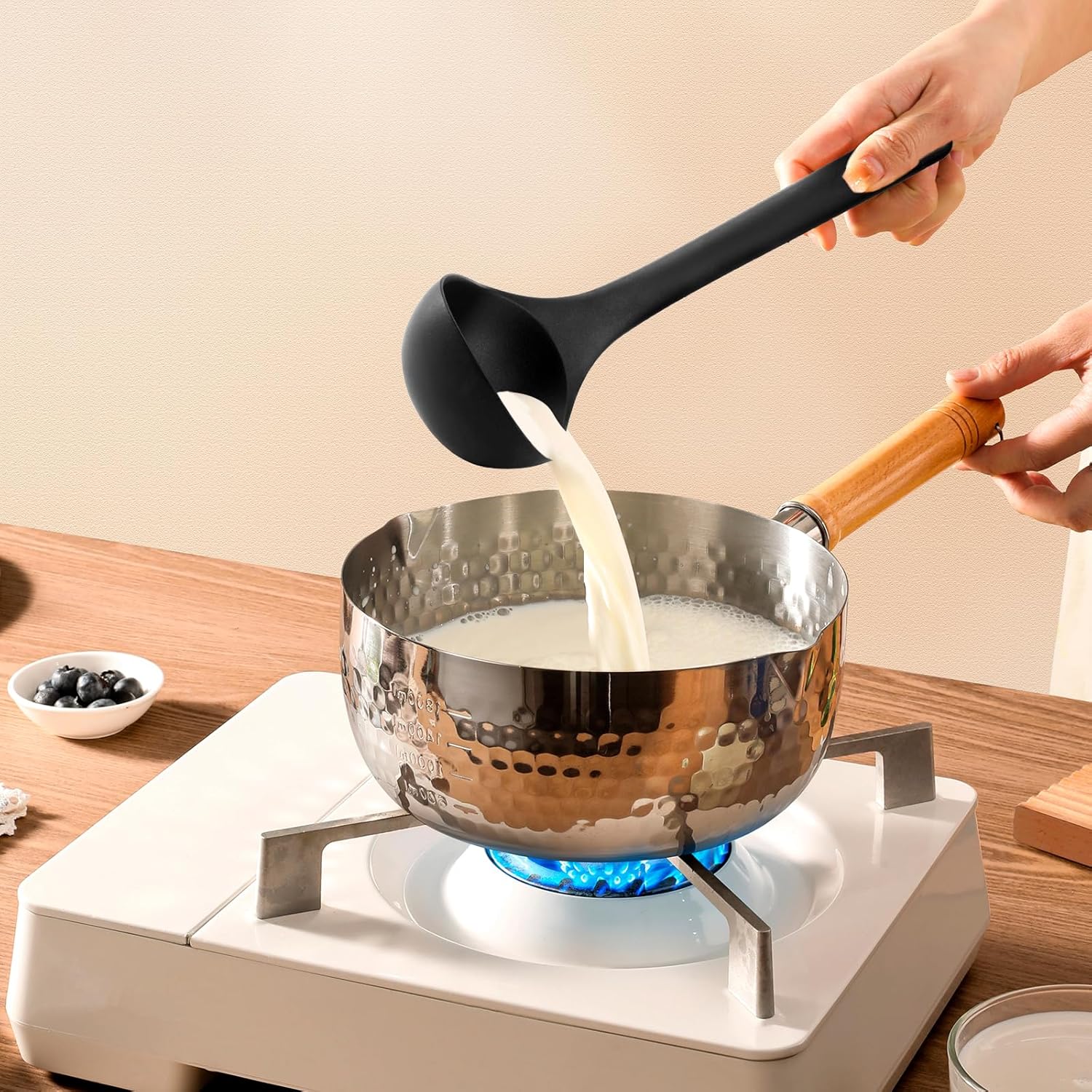 - LONG SEAMLESS INTEGRATED DESIGN - The sizes are about 13.6 inch in length and are perfect for most mixing, stirring, serving, basting needs. The handle is long enough for most large cookware without being too big to use at the table. Long length keeps your hand far from the heat.