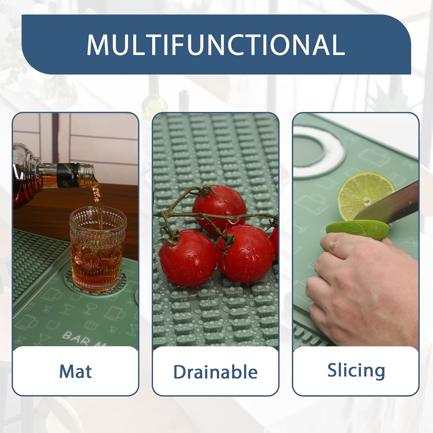 - 🚀 UNFOLD PROFESSIONAL BARTENDING ANYWHERE: This versatile 3-in-1 silicone mat combines a spill-catching drying mat, a removable cutting board for garnishes/fruit, and an integrated rimmed tray for perfect salt/sugar glass rims. Instantly create a dedicated, mess-free cocktail station on any countertop!