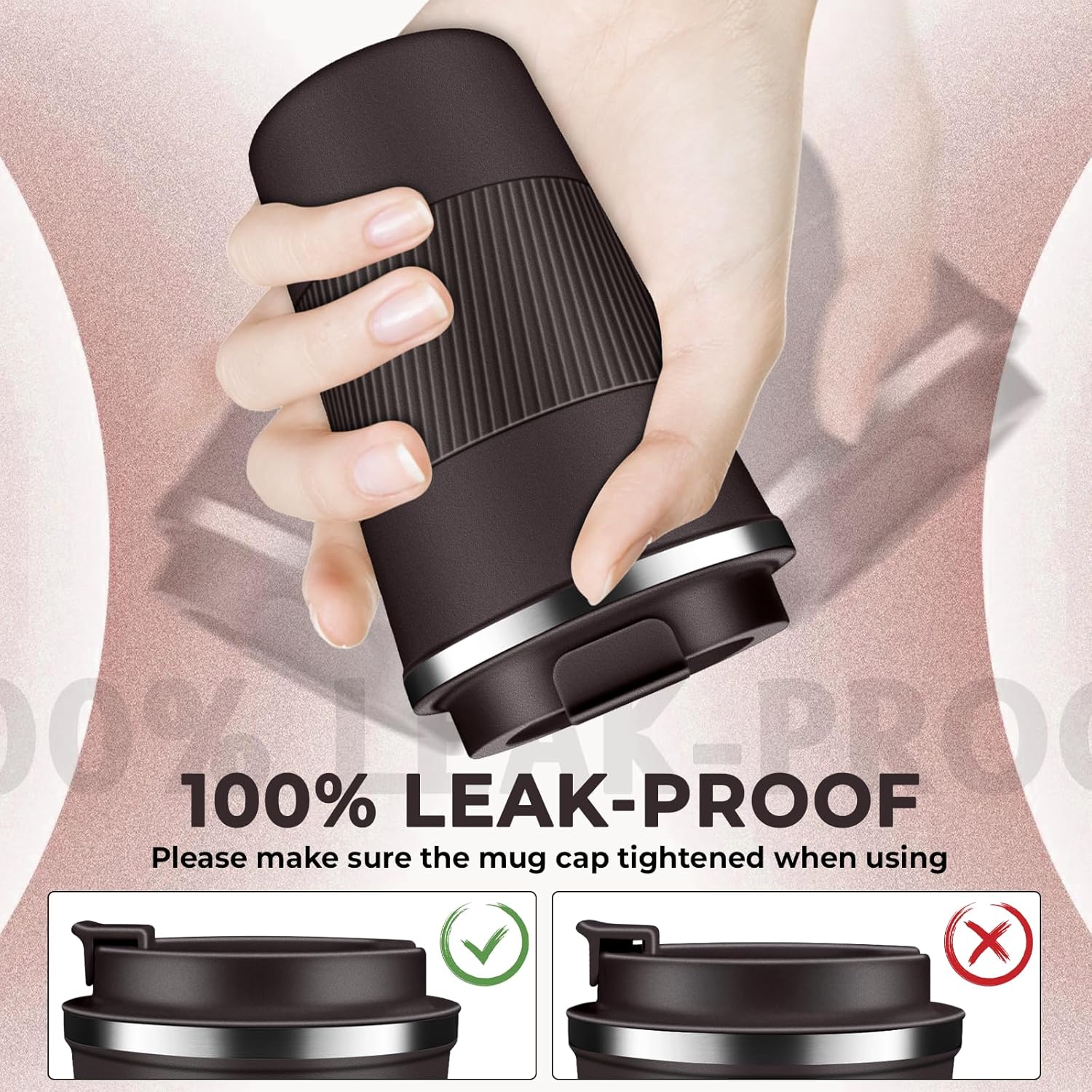 - Leak-Proof & Easy to Clean: The travel coffee mug features a secure screw lid with a sealing silicone strip and a convenient one-hand 180° flip-top snap for splash-free sipping, the wide mouth allows for easy filling and cleaning, comfort-grip silicone sleeve ensures a non-slip, secure hold, quiet base prevents slip