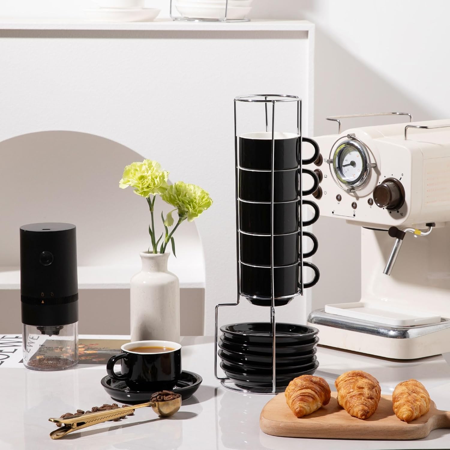 Sweejar Ceramic Espresso Cups Set of 6, Espresso Cup Stackable, 4 Oz Stackable Cappuccino Cups with Saucers and Metal Stand for Coffee Drinks, Americano, Latte, Tea (Black)