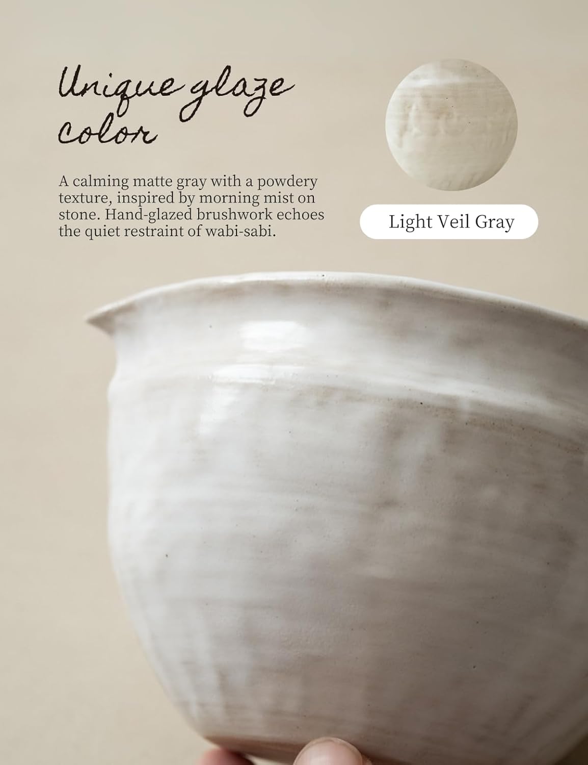 - Handcrafted Wabi-Sabi Bowl with Light Veil Gray Hand-shaped with natural thickness variations, then brush-glazed stroke by stroke. Each product is unique.Featuring a smoothly glazed interior for easy cleaning High-temperature fired , food-safe, microwave-safe, and dishwasher-safe. Soft, muted elegance — A calming matte gray with gentle, powdery texture, inspired by morning mist on stone.