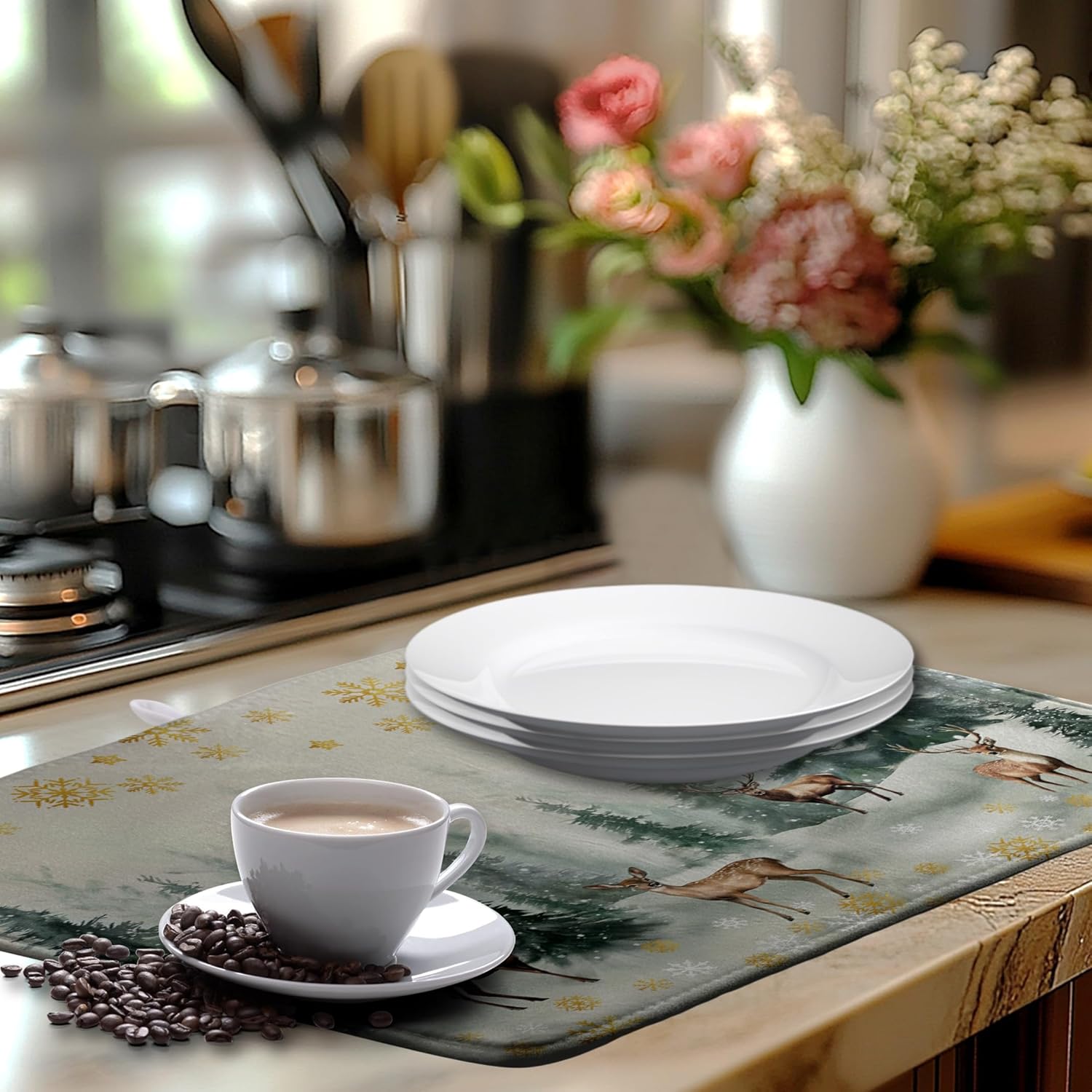 Winter Deer Snowflakes Dish Drying Mat Christmas Snow Forest Large Kitchen Mats Dish Drying Pad Absorbent Dish Dryer Mat for Kitchen Countertops Microfiber Drainer Pad Dish Drying Mats (18x24 in)