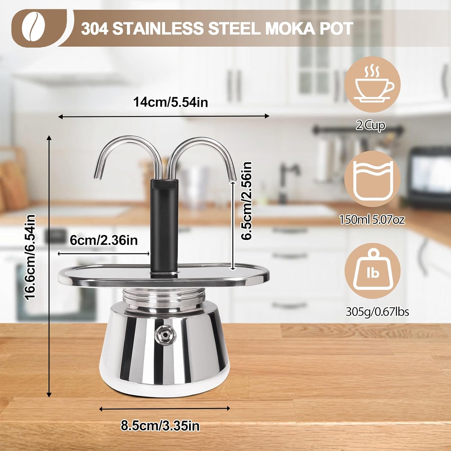 Uncoated 2 Cup Dual Pipe Moka Pot 304 Thickened Stainless Steel Mini Coffee Maker Stovetop Espresso Coffeemaker Italian Classic Style Brewing Greca Cafe Mocha Machine for Camping Travel Home 150ml