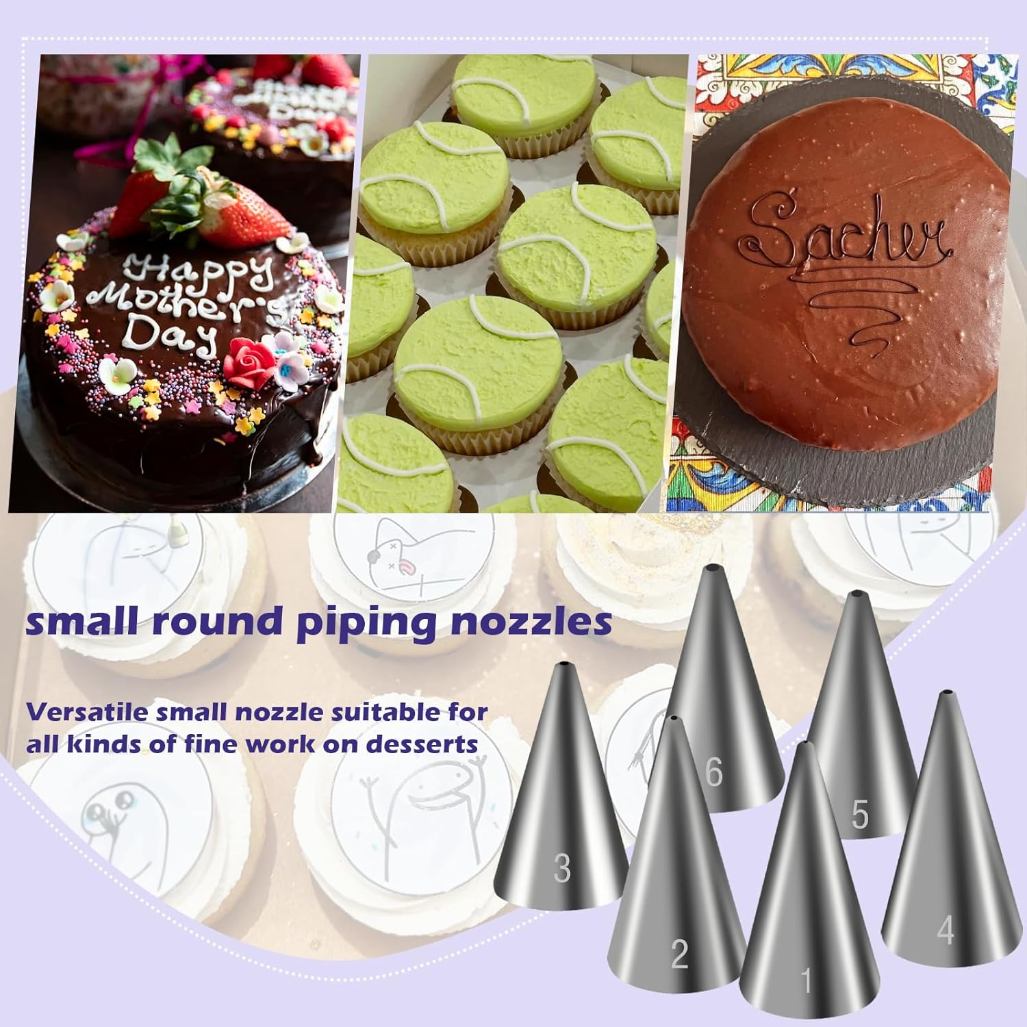 - Versatile Small Designs: Pipe consistent small dots, bead borders, fine borders, thin rope designs, and controlled fill-ins. Excellent all-purpose small tips for detailed work on various desserts (#4 & #5 tips)