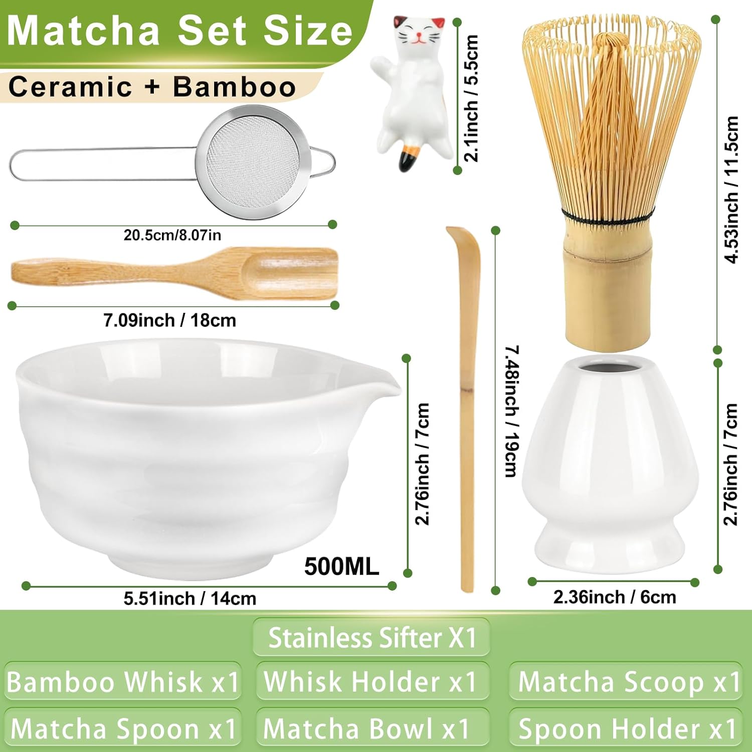 - Quality 7 Pcs Matcha Kit Set: 1 x ceramic matcha bowl with spout (500 ml), 1 x bamboo matcha whisk, 1 x ceramic stand for the matcha whisk, 1 x stainless steel sifter, 1 x scoop, 1 x tea spoon, 1 x cat style ceramic scoop holder. The matcha bowl is the same color as the whisk holder, giving it an elegant aesthetic