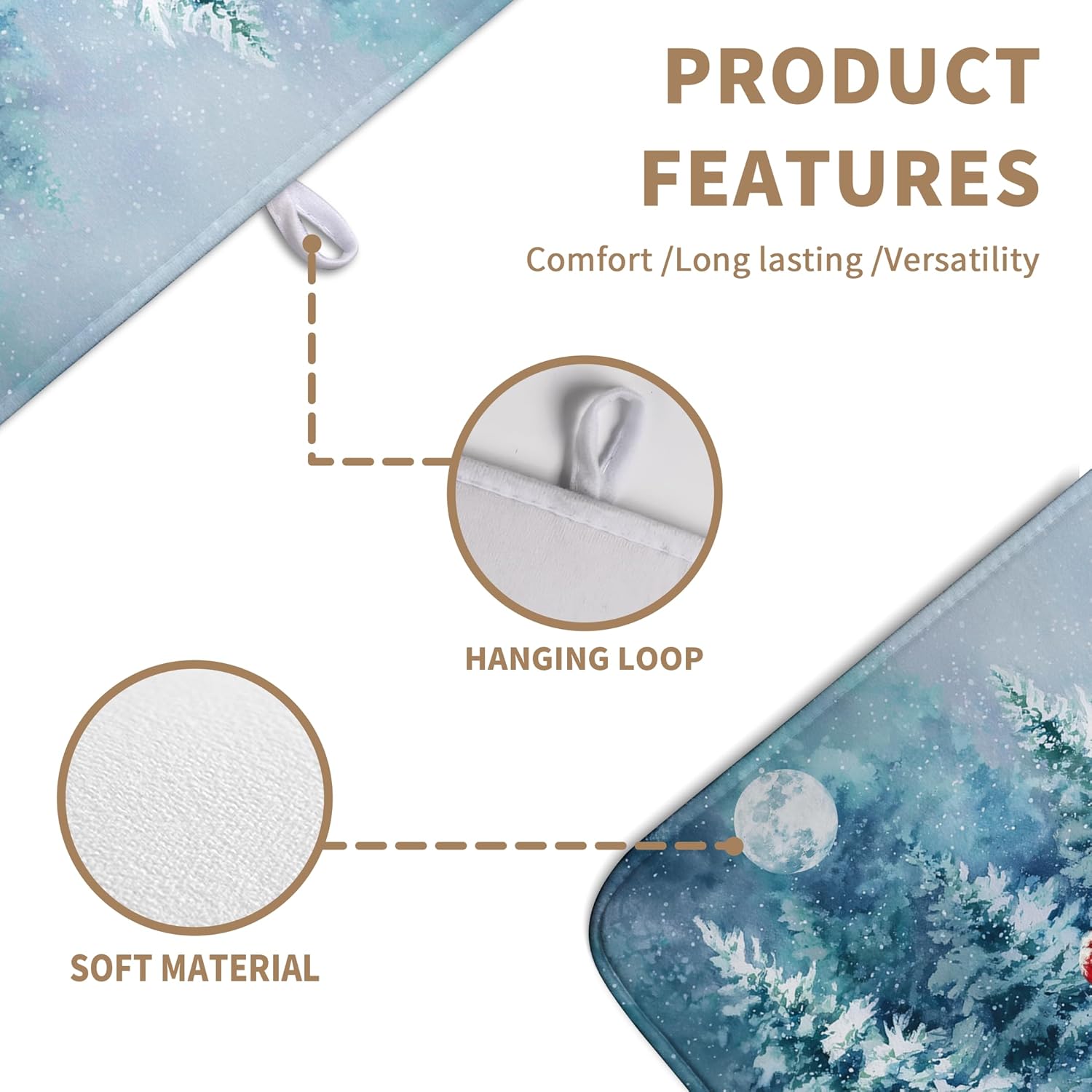 - [Space Saving]: This Winter Pine Tree lightweight absorbent dish drying mat has a webbing lanyard in the middle of the horizontal side for hanging, and large drying mat for kitchen counter Christmas Snow Forest dish drying matt kitchen counter can also be folded and thrown into a drawer or stuffed elsewhere.