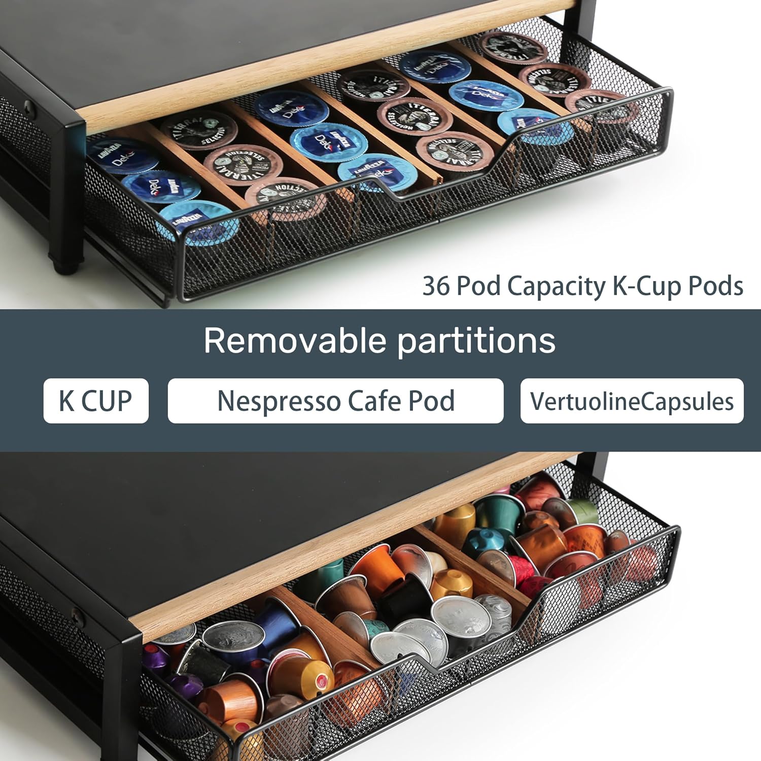 - Adjustable Wooden Dividers: Made with high-quality removable wood dividers that can be customized to fit various pod sizes, making it ideal for use as a universal coffee pod storage drawer.