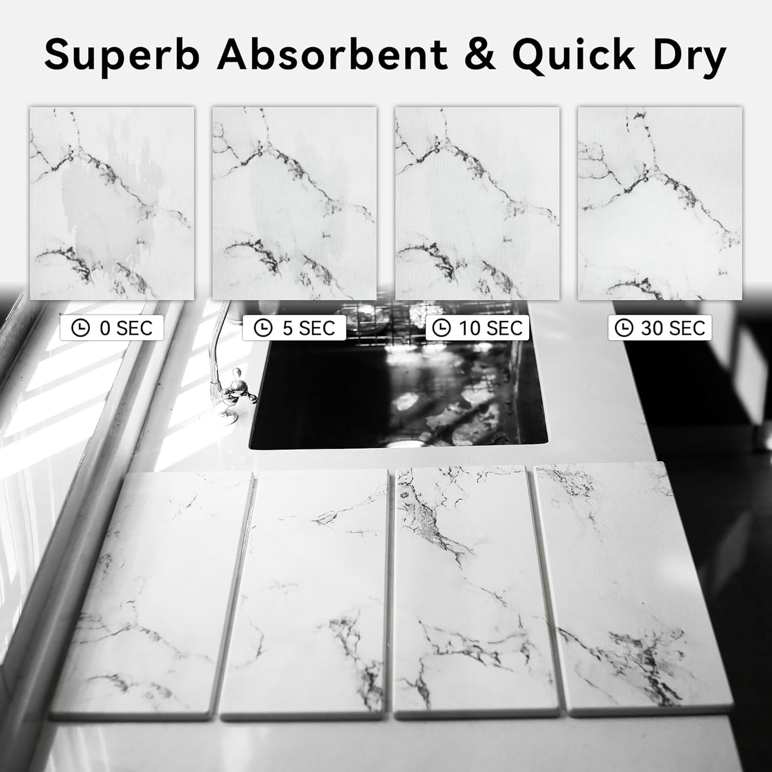 - Super Absorbent Stone Dish Drying Mat: Made of 100% natural diatomaceous earth, this diatomaceous earth drying mat has super absorbent properties and can absorb moisture in seconds, quickly drying and keeping the tabletop dry. Paired with marble texture, it is a sustainable and safe choice for your kitchen, balancing environmental protection with fashion.