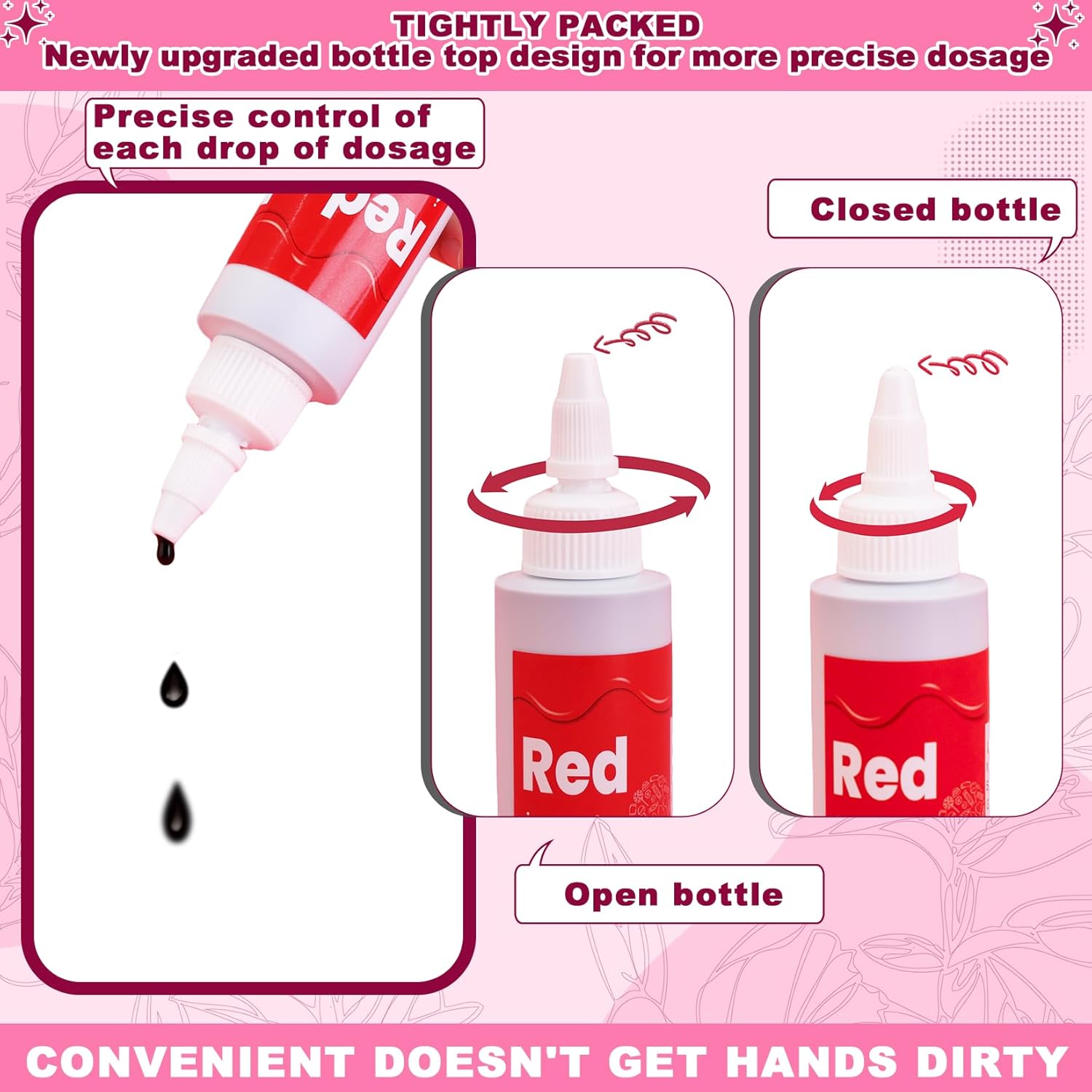 - UPGRADED BOTTLE MOUTH, PRECISE CONTROL - The bottle of our food coloring for icing has been completely upgraded, with a special bottle mouth and a squeeze bottle body design. You only need to twist the bottle mouth to open it, and then gently press the bottle body to use it, which can accurately control every drop of food coloring liquid for cake decorating. And there is a leak-proof aluminum foil inside the bottle to ensure that there will be no leakage during transportation.