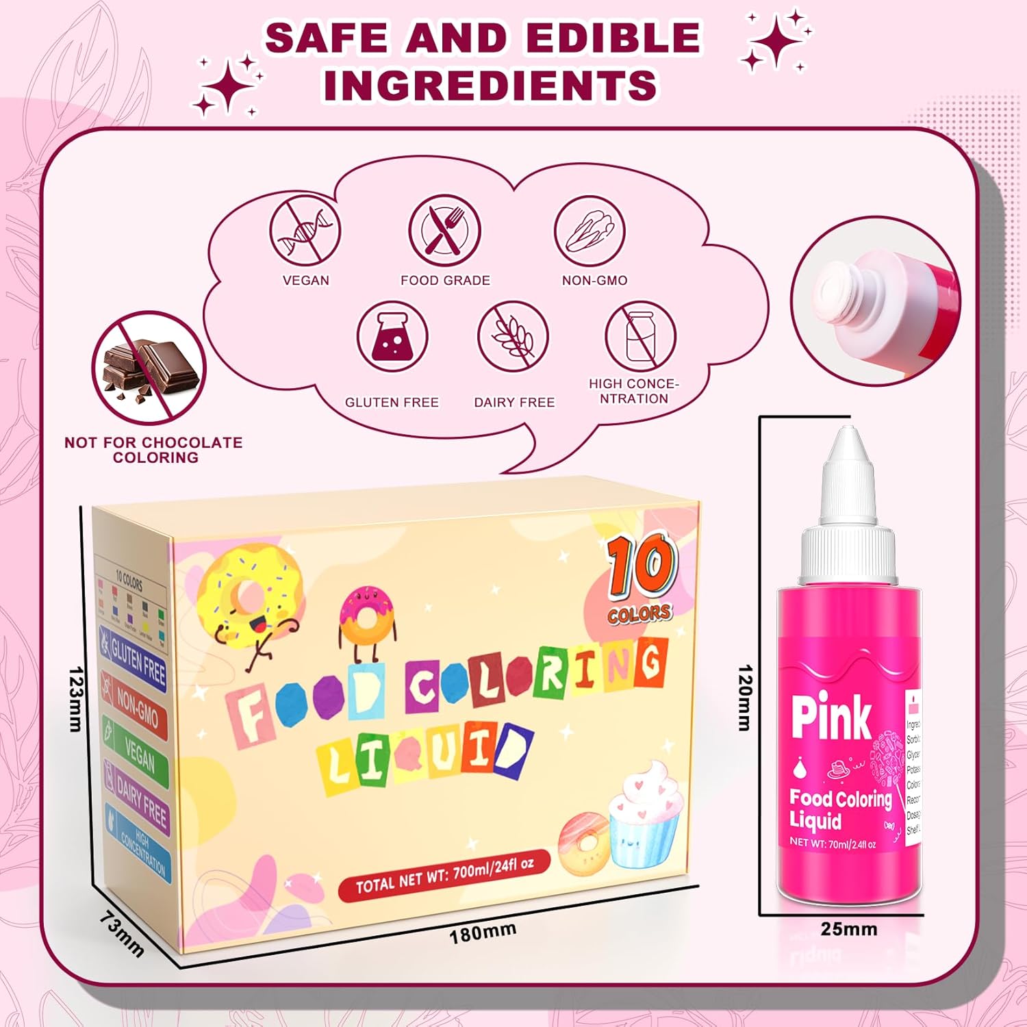 - 70ML LARGE CAPACITY - Each bottle of our food dye liquid has a large capacity of 70ml(2.4 fl. oz), which can be consumed for a longer time than others small-capacity liquid edible paint. Whether it is daily creation by home baking enthusiasts or batch production by professional bakers, it can meet long-term use needs.