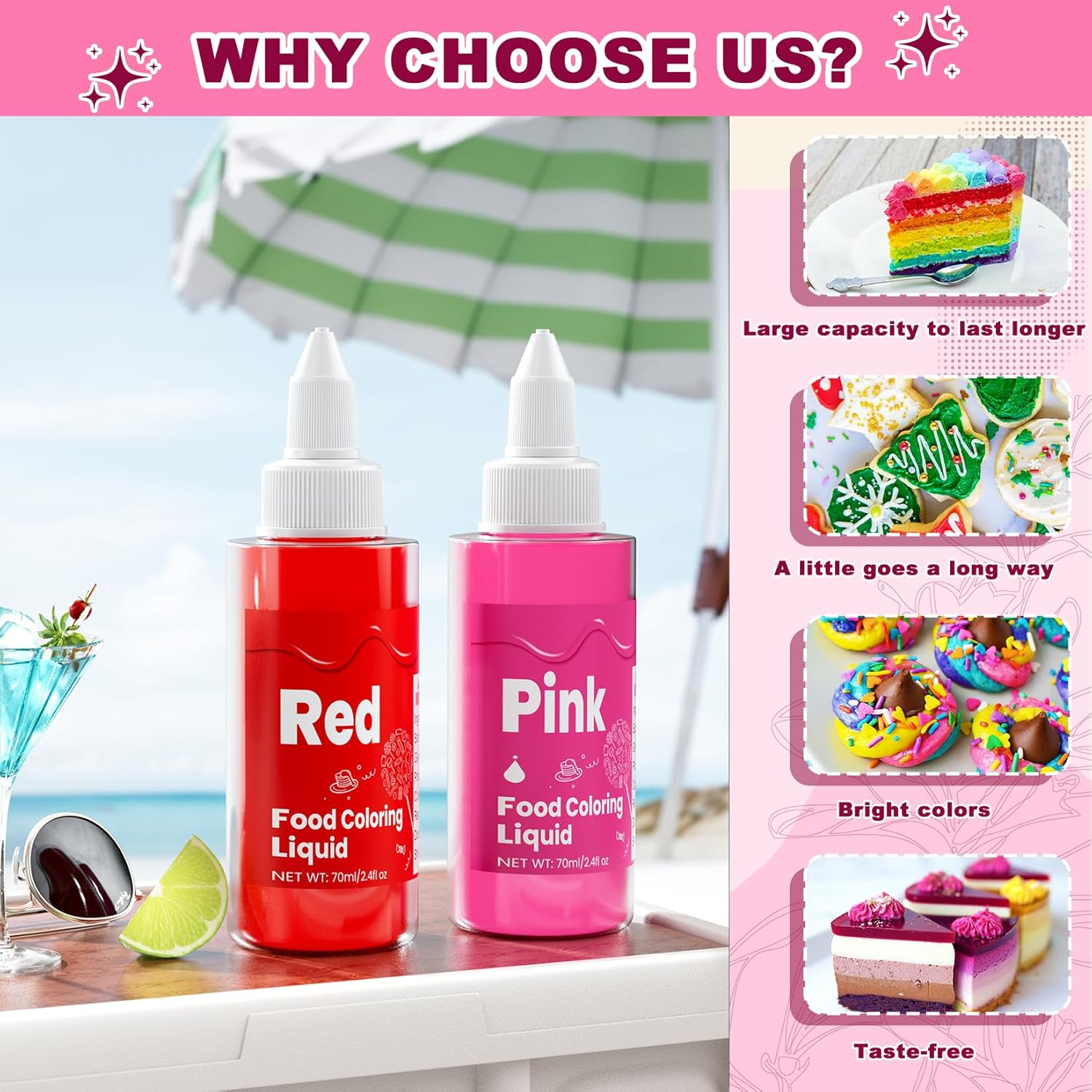 Food Coloring Liquid -10 Colors x 70ml Food Dye Set, Large Capacity Vibrant Edible Paint for Frosting, Cake Decorations, Easter Egg, Baking, Fondant, Slime Making Kit, Easy to Use - 24 Fl. oz