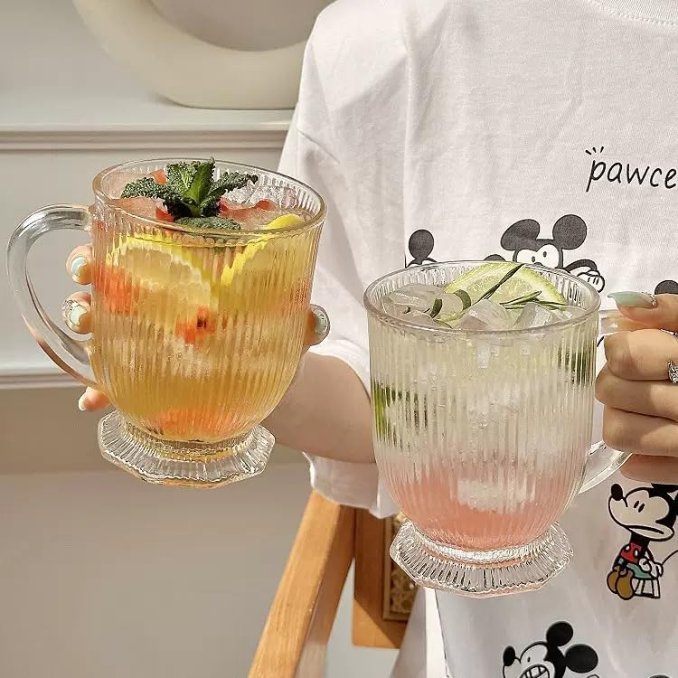 Clear Ribbed Glass Coffee Mugs Set of 4 with Spoon,16 Oz Large Glass Tea Cups with Handle Diner Latte Cups with Footed Base for Hot Beverages,Cappuccino & Espresso Cups, Stylish Drinkware