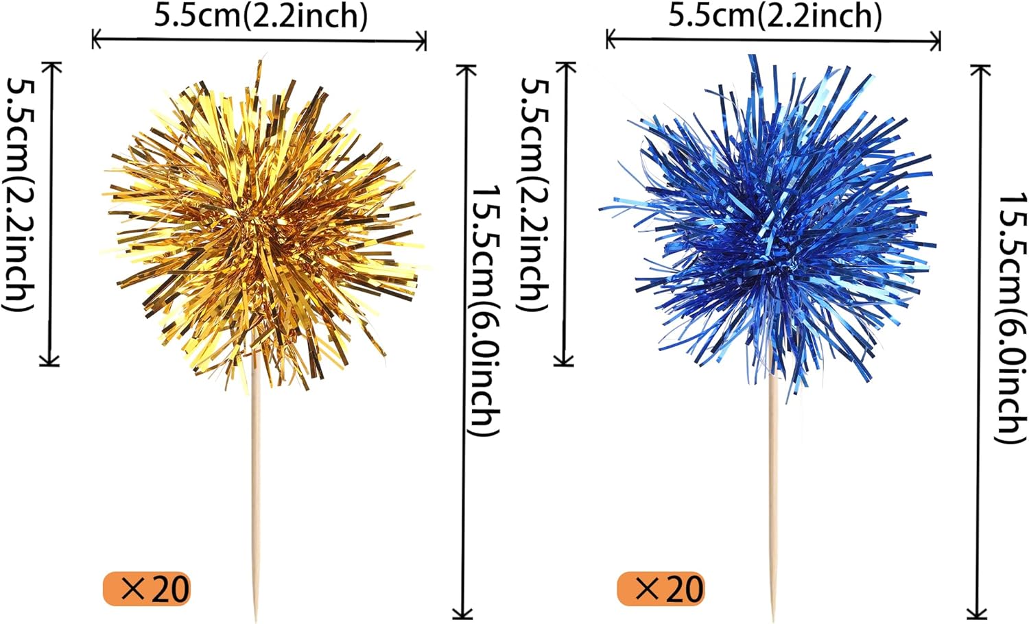 40 PCS Foil Firework Cupcake Toppers Sparkle Tinsel Cupcake Picks Fireworks Birthday Party Decorations Cocktail Fruit Toothpick for Birthday Wedding Graduation Party Decorations Supplies Gold Blue