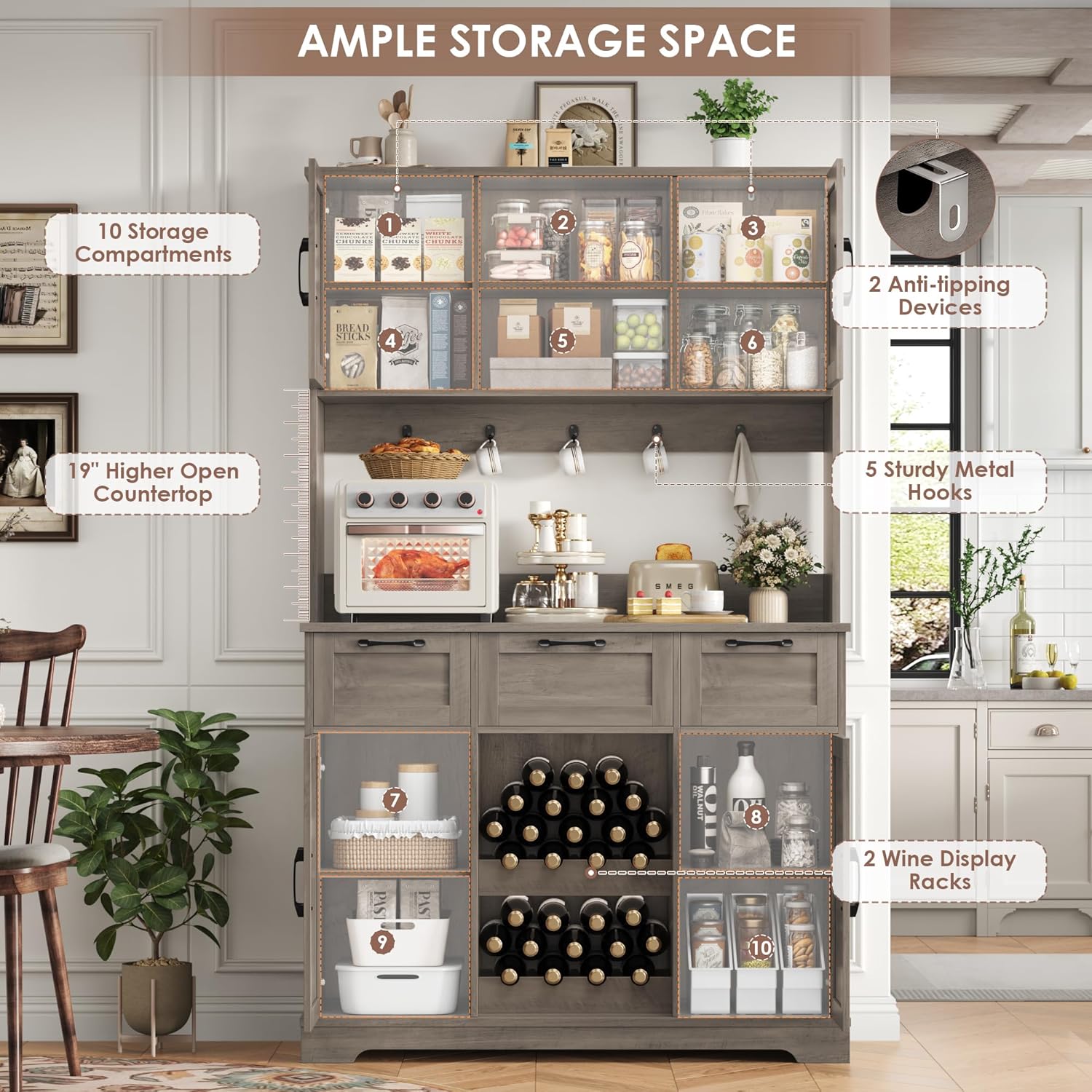 - AMPLE STORAGE SPACE: This large kitchen pantry cabinet combines a buffet with an upper hutch for maximum storage capacity. The upper hutch features six compartments with two adjustable shelves for flexible organization. The bottom buffet offers three drawers, four fixed shelves, and two wine racks—perfect for storing tableware, dry goods, and your wine collection. It meets all your storage needs, helping you maximize space while minimizing clutter