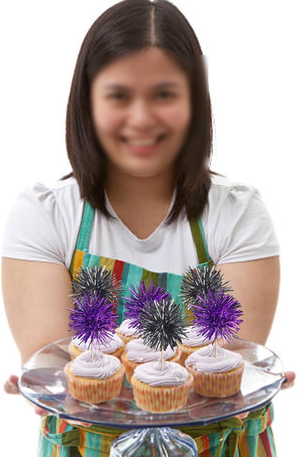 40 PCS Foil Firework Cupcake Toppers Sparkle Tinsel Cupcake Picks Fireworks Birthday Party Decorations Cocktail Fruit Toothpick for Birthday Wedding Graduation Party Decorations Supplies Black Purple